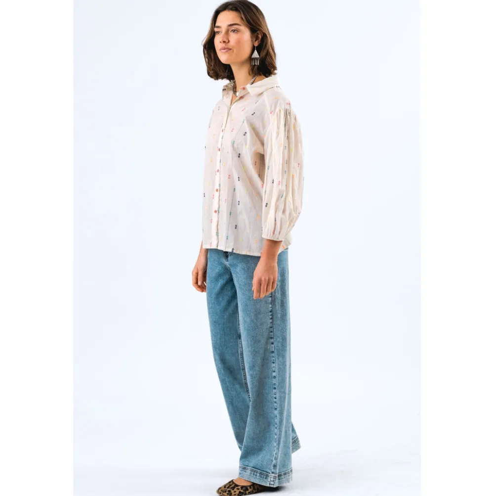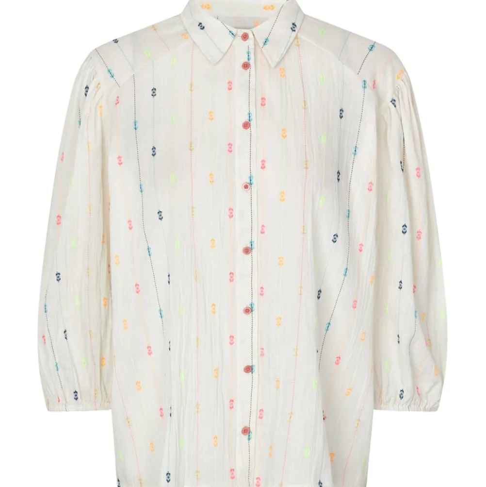 Super sød og elegant skjorte fra Lollys Laundry med små broderinger i forskellige farver og farvede små knapper. Med trekvartlange ærmer og klassisk krave.