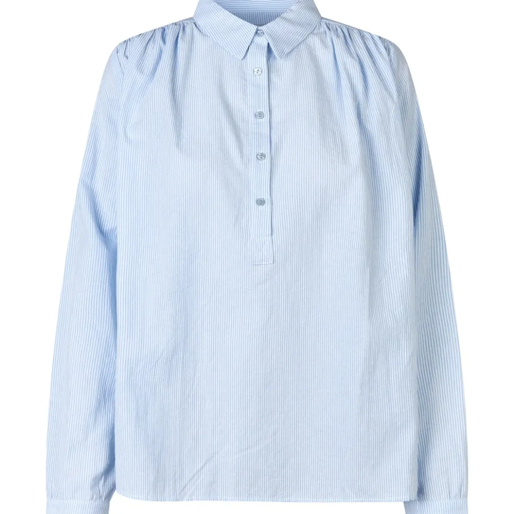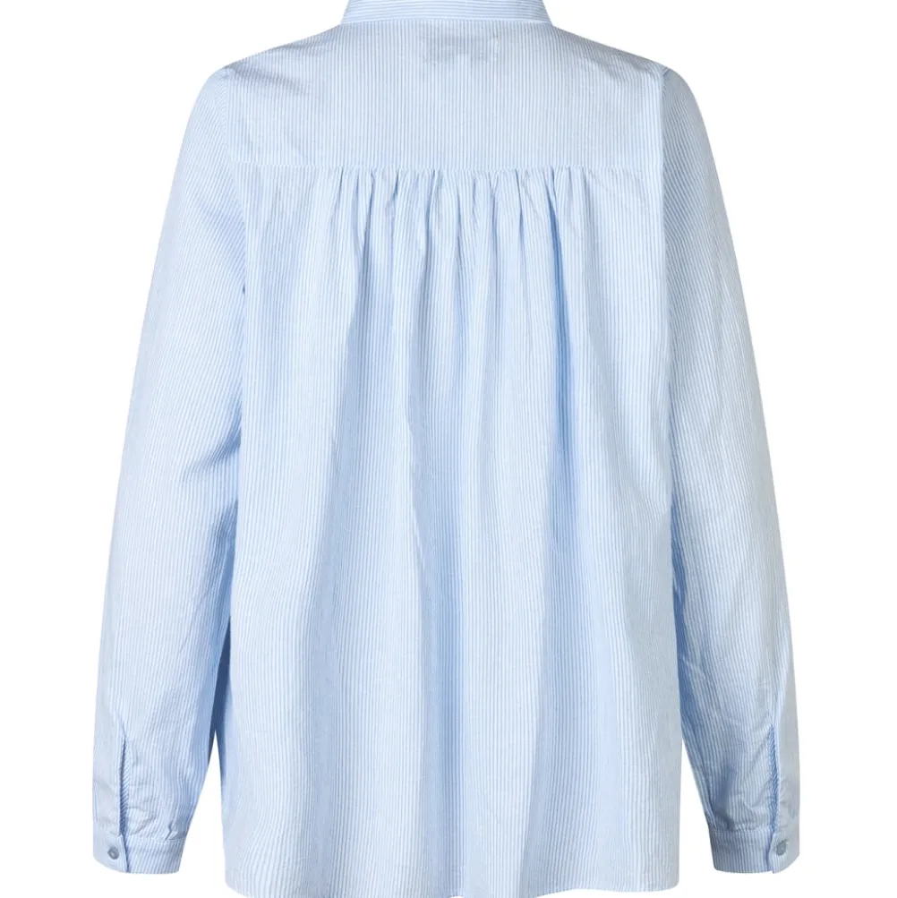 Super fin skjortebluse fra Lollys Laundry med tynde striber. Med fine rynkedetaljer ved skuldrene og bagpå, samt med lille krave. Løs pasform.