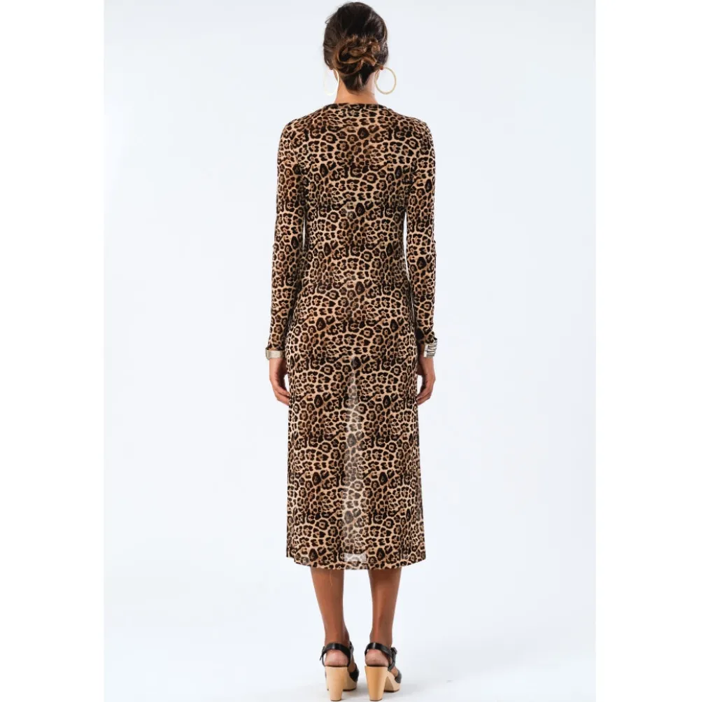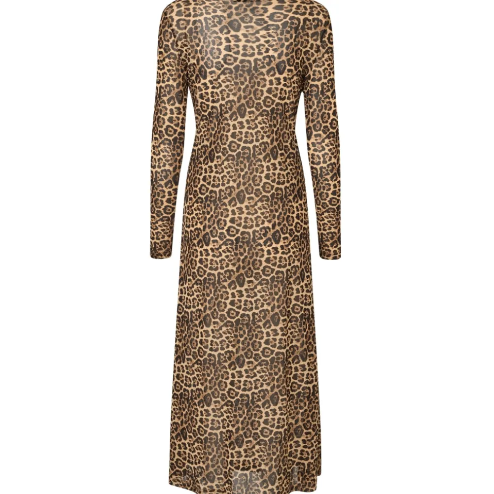 Flot tætsiddende lang kjole fra Lollys Laundry med leopardprint. Med rund hals og lange ærmer. Kan styles både op og ned.