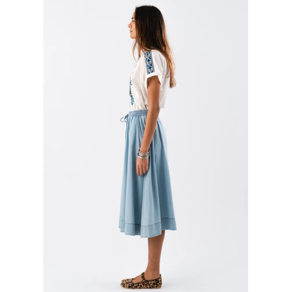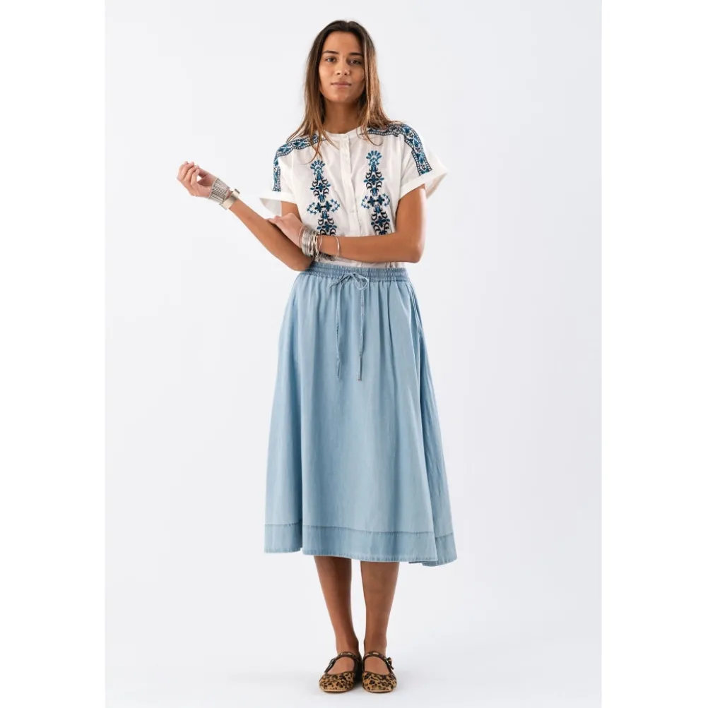 Smuk skjorte med de fineste blå broderinger fra Lollys Laundry. Med knaplukning og korte ærmer med opsmøg.
