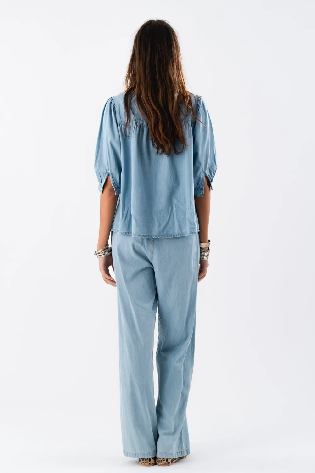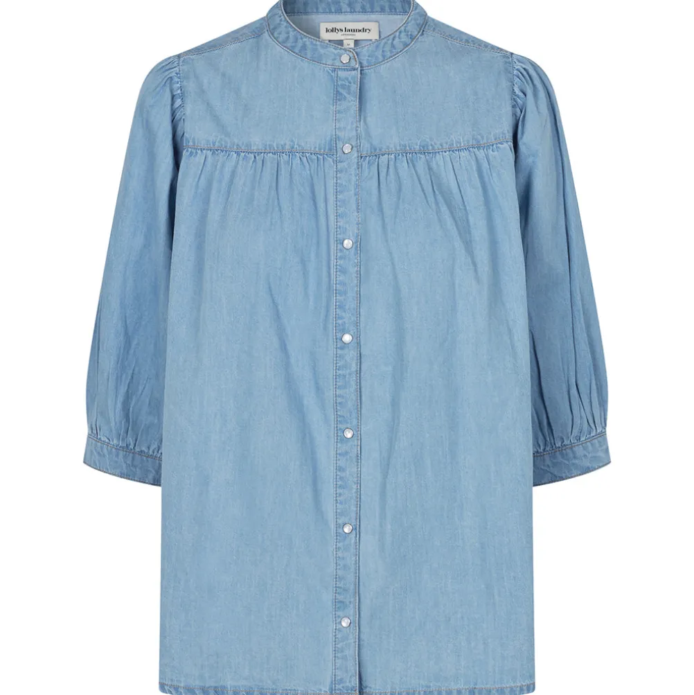 Super cool denimskjorte fra Lollys Laundry med trekvartlange ærmer og små fine trykknapper, samt rynk ved skuldrene.