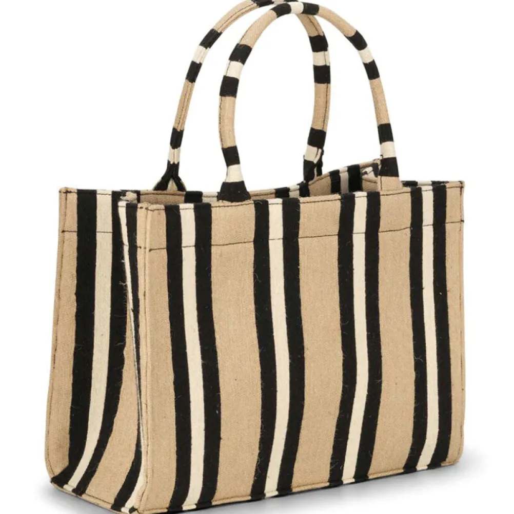 Flot stor taske med fine striber fra Luna Moon lavet i bæredygtige naturprodukter. Tasken har tre lommer, hvor den ene lukkes med lynlås. Tasken lukkes med magnetisk trykknap og har 4 “fødder” i metal. Perfekt som strandtaske eller shopper.