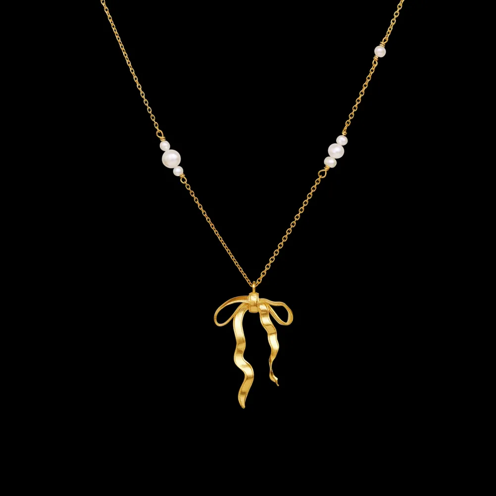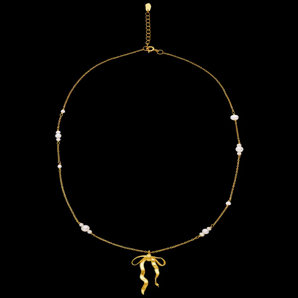 Smuk halskæde med sløjfevedhæng og små ferksvandsperler fra Maanesten. Fås både i guld og sølv.