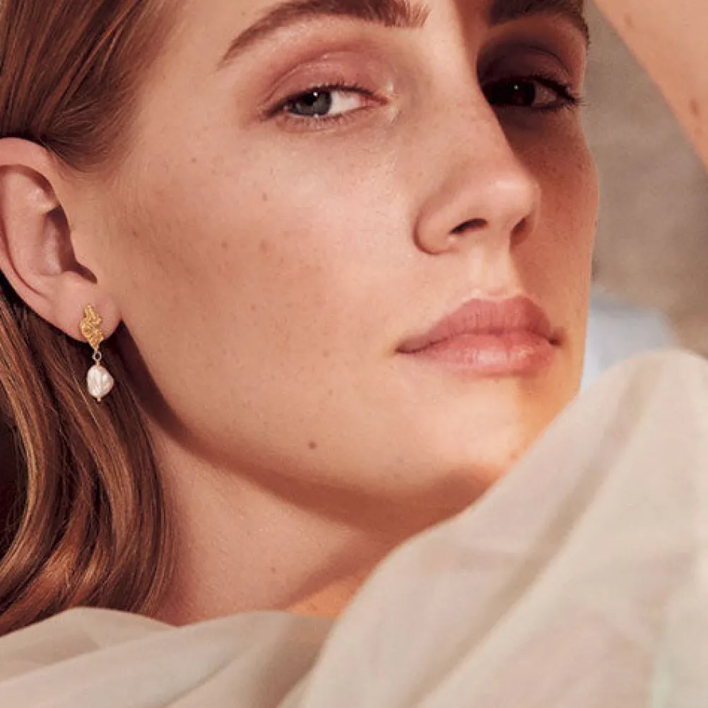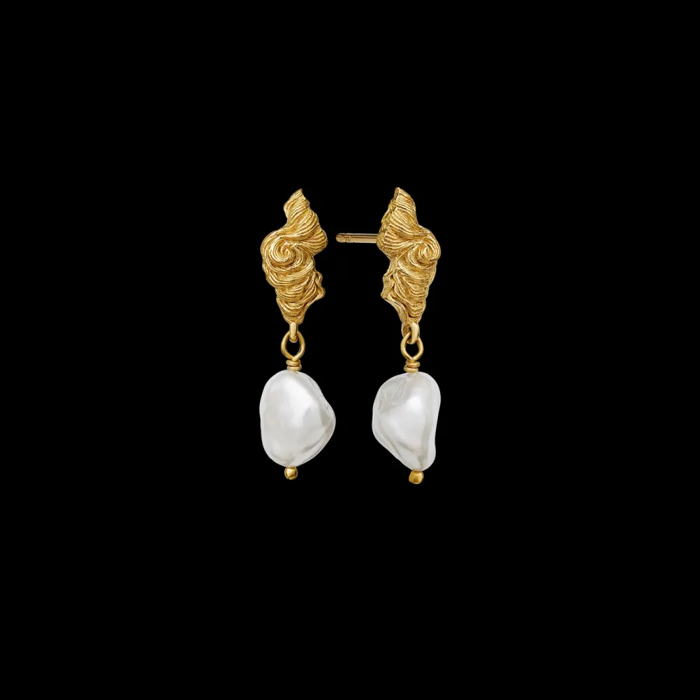 Flotte forgyldte øreringe fra Maanesten med fine snoede konkylier med en stor hvid ferskvandsperle som vedhæng.