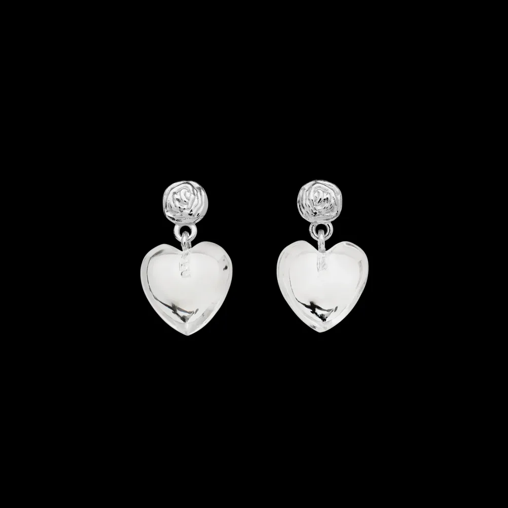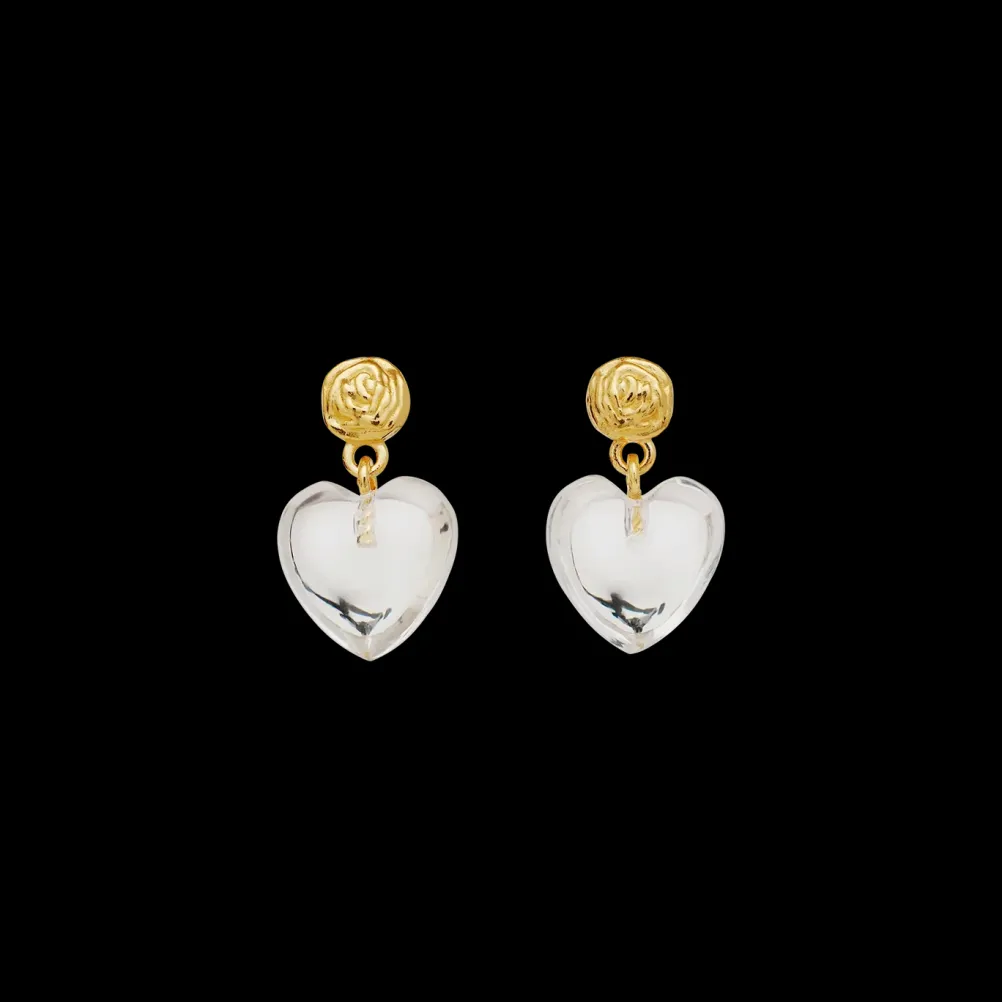 Smukke petit rose-øreringe med hjerteformede krystalvedhæng fra Maanesten. Fås både i guld og sølv.