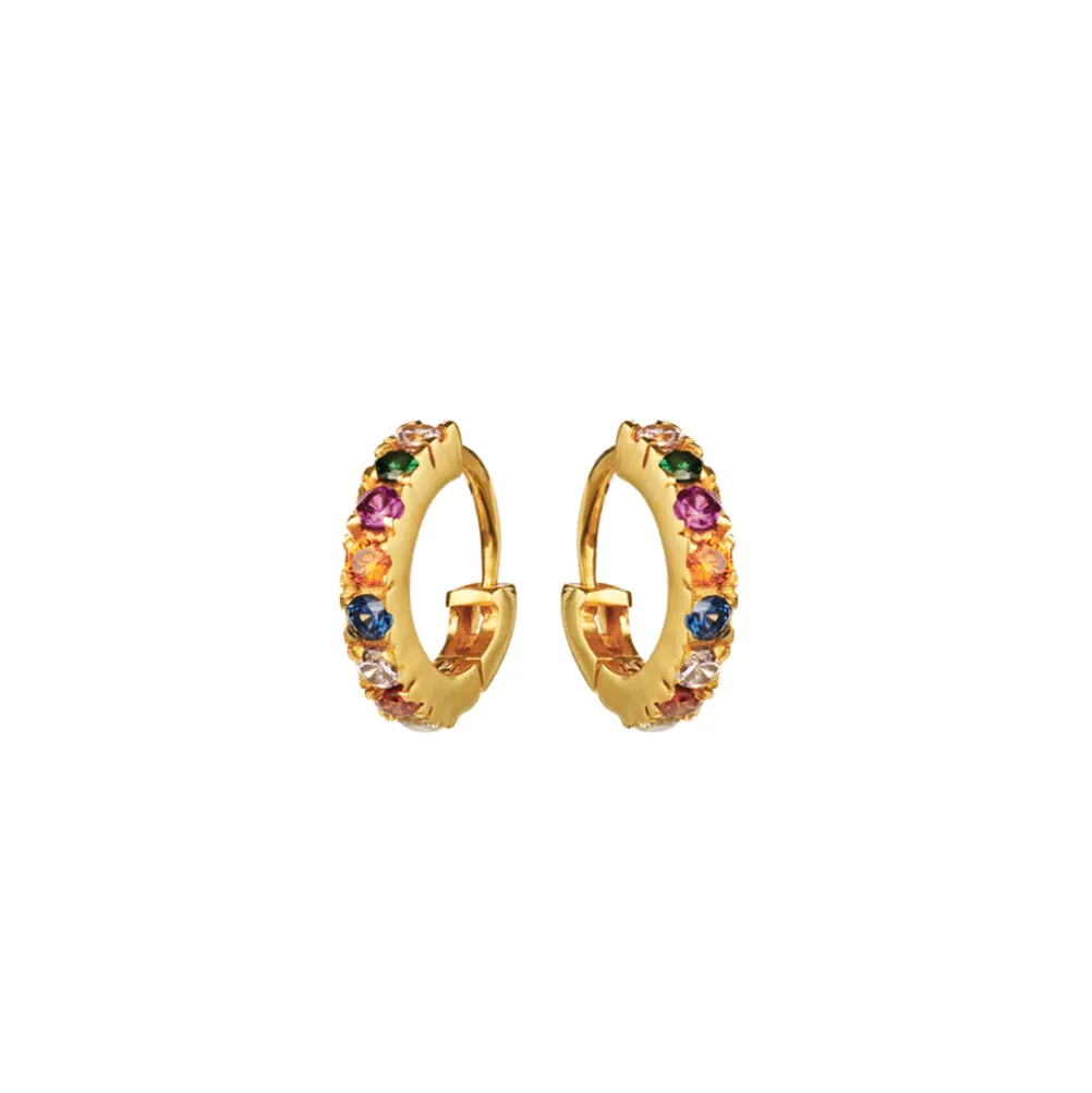 Små smukke hoops øreringe med farverige zirkoner hele vejen rundt, i forgyldt sterlingsølv og med blankt poleret finish. Elegante til hverdag og fantastiske til fest.