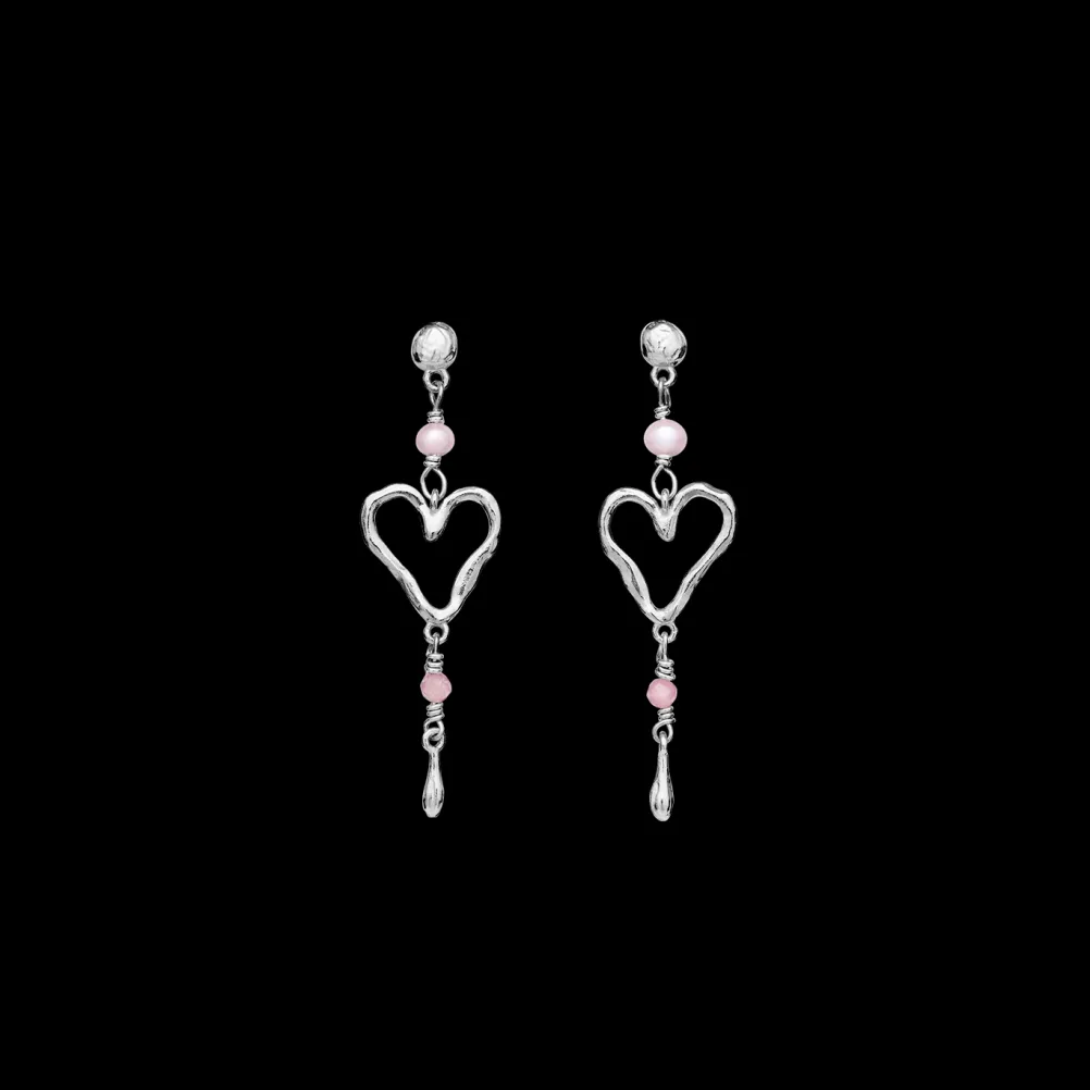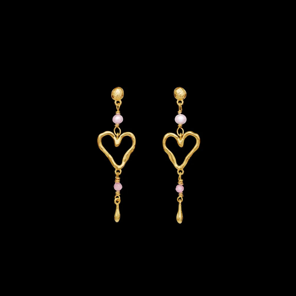 Smukke øreringe med hjerte-vedhæng og lyserøde perler fra Maanesten. Fås både i guld og sølv.