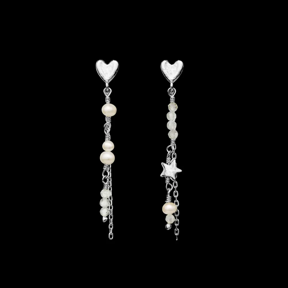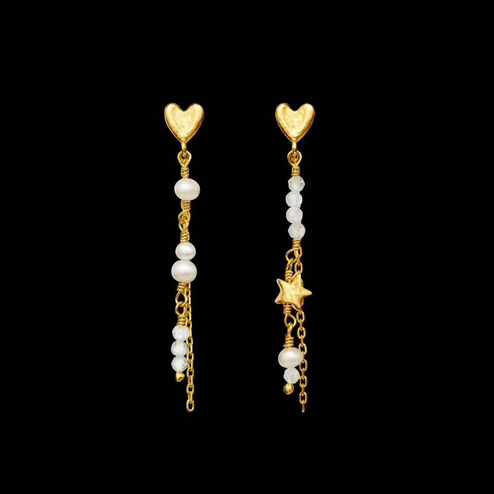 Smukke stjerneskuds-øreringe med små hjerter og små ferskvandsperler fra Maanesten. Fås både i guld og sølv.