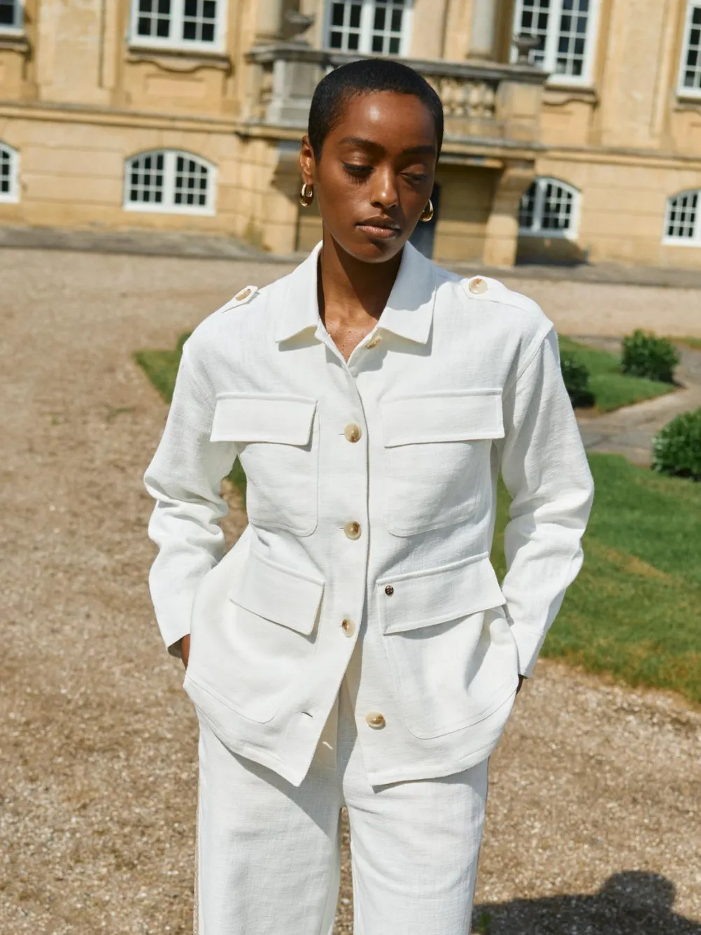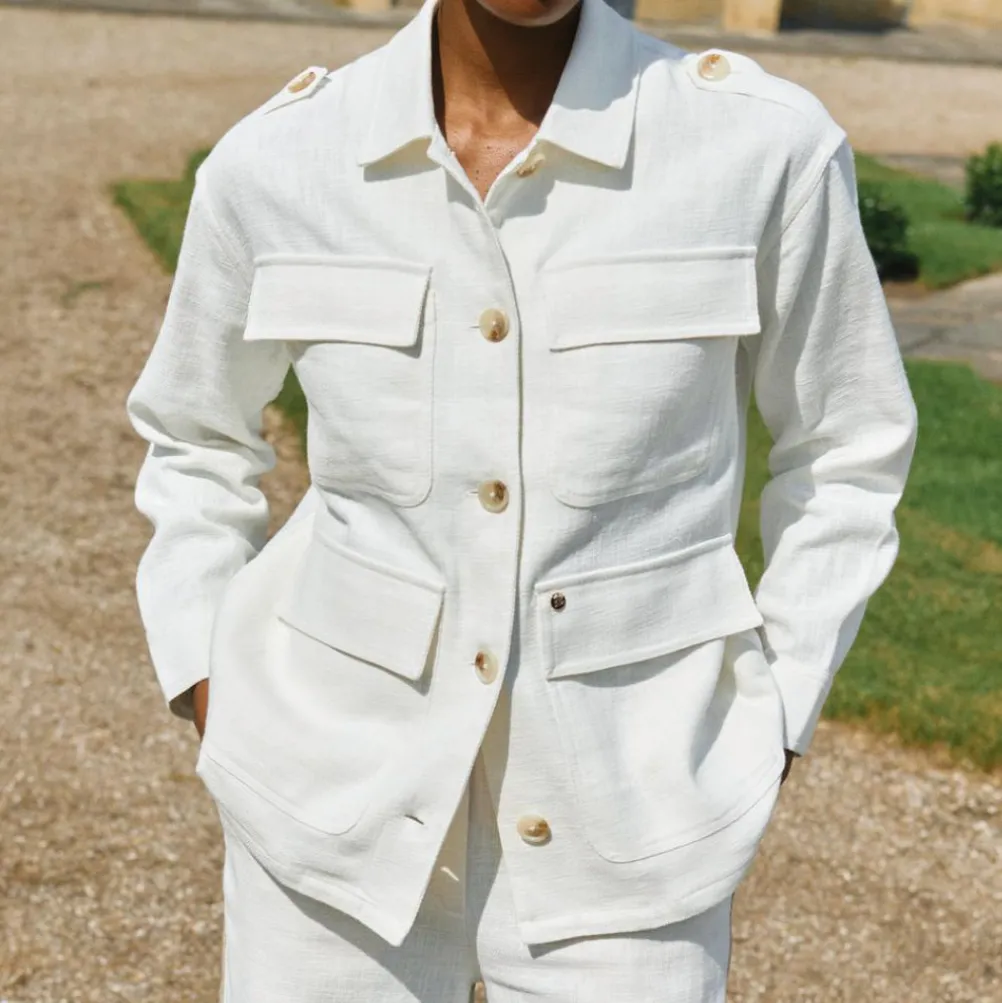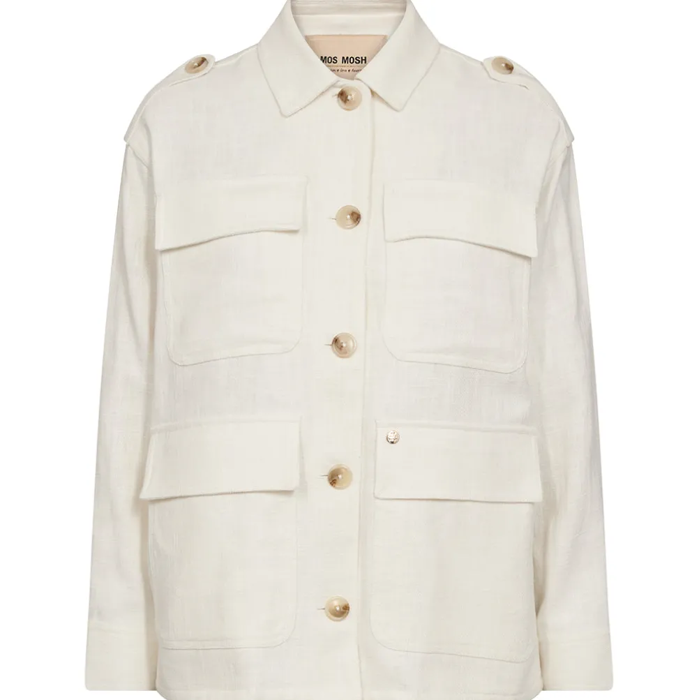 Flot safari-inspireret jakke fra Mos Mosh fremstillet i en blanding af bomuld og ramie for et struktureret, hør-lignende look. Med flere lommer og lysebrune knapper. Perfekt til foråret/sommeren.