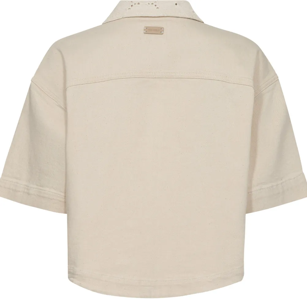 Flot elegant skjorte i kraftig kvalitet med korte ærmer og sød blondelomme fra Mos Mosh. Med mørke knaplukning.