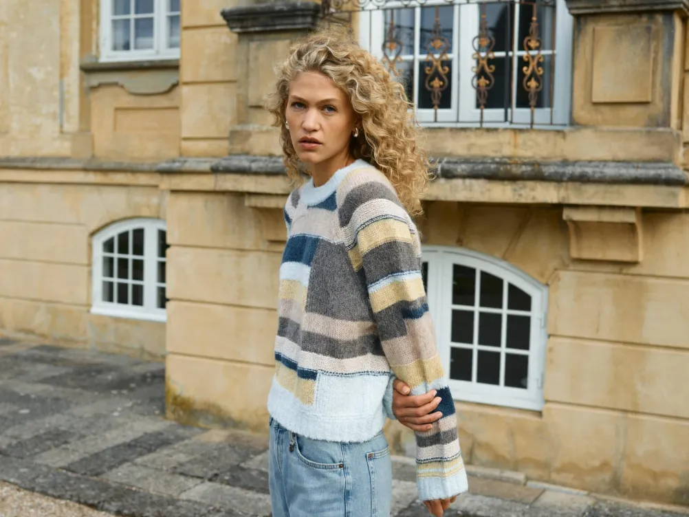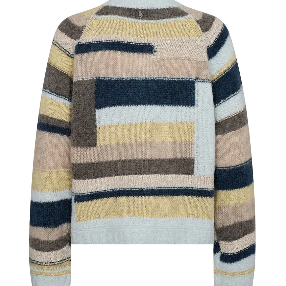 Lækker unik stribet sweater i smukke blå nuancer fra Mos Mosh i regulær pasform. Håndlavet patchwork-strik.