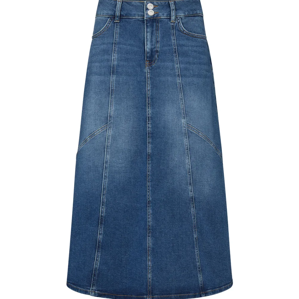 Flot og elegant lang denimnederdel fra Mos Mosh med fine detaljer. Designet i et a-snit, som går til lige under knæene. Med flere indsnit som en cool finish.