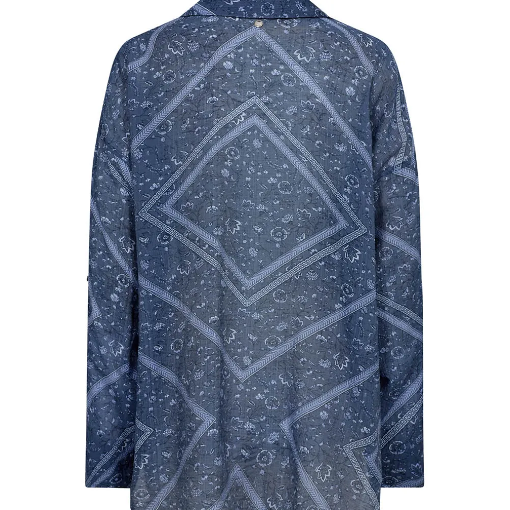 Smuk lang bluse fra Mos Mosh med flot grafisk mønster og v-udskæring med fine flæser. Perfekt til både hverdag og fest.