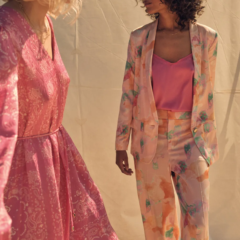 Super smukke bukser fra Mos Mosh med det fineste håndmalede vandfarvede mønster. Designet i en flot wide-leg-pasform med middel talje. Med pressefolder som en sofistikeret finish. Perfekte til foråret/sommeren.