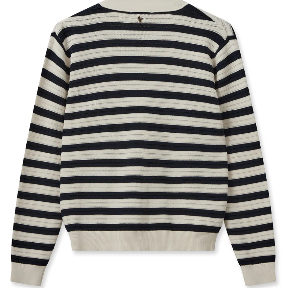 Lækker stribet cardigan fra Mos Mosh med smukke guldknapper. Designet i en løs silhuet med en flot V-hals og knaplukning, som passer perfekt til både jeans og bukser.