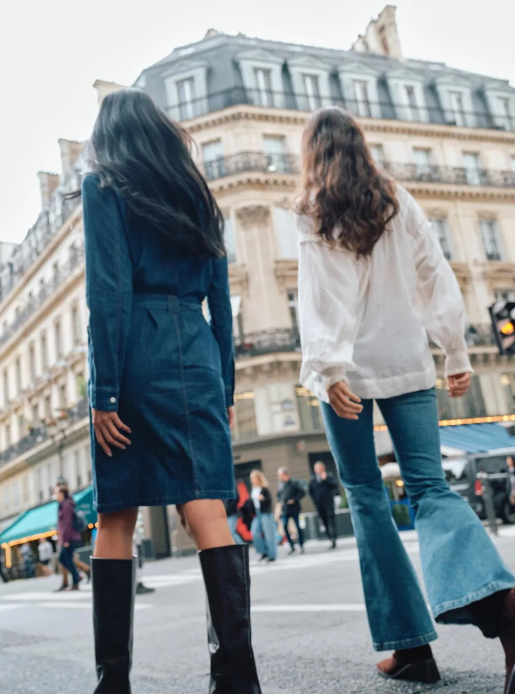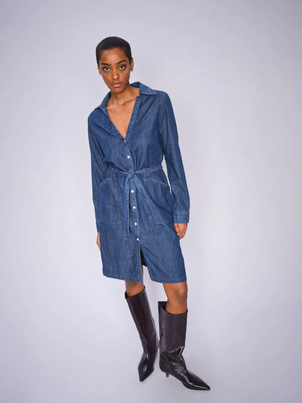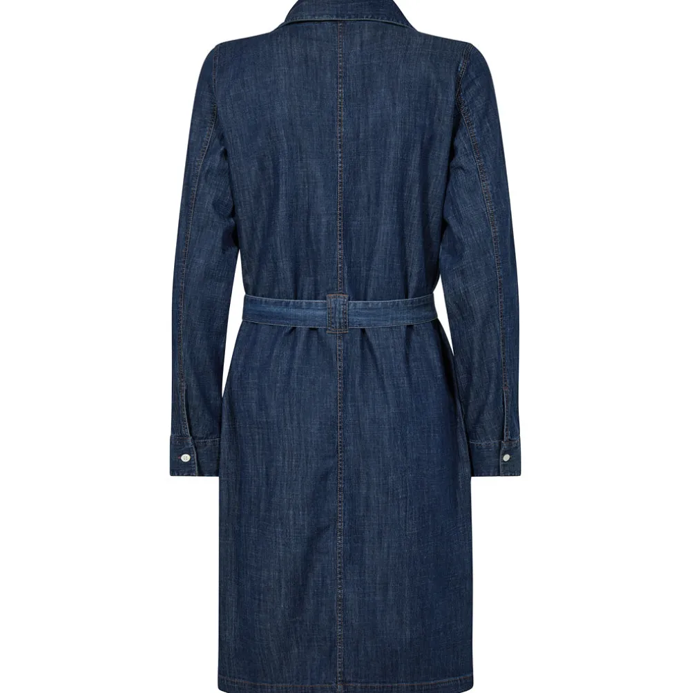 Flot elegant denimkjole fra Mos Mosh med v-udskæring og bindebånd i taljen. Fremstillet i en blød blanding af bomuld og tencel.