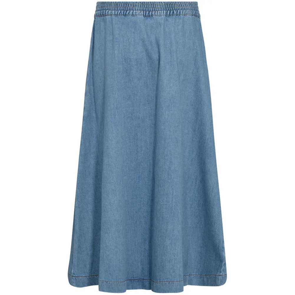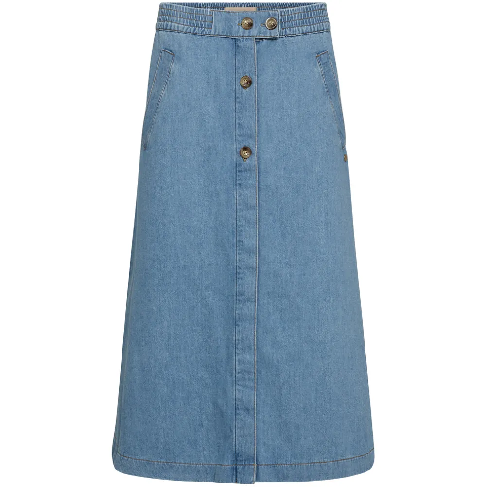 Flot lyseblå lang denimnederdel fra Mos Mosh med fine knapdetaljer. Designet i et a-snit, som går til lige under knæene.