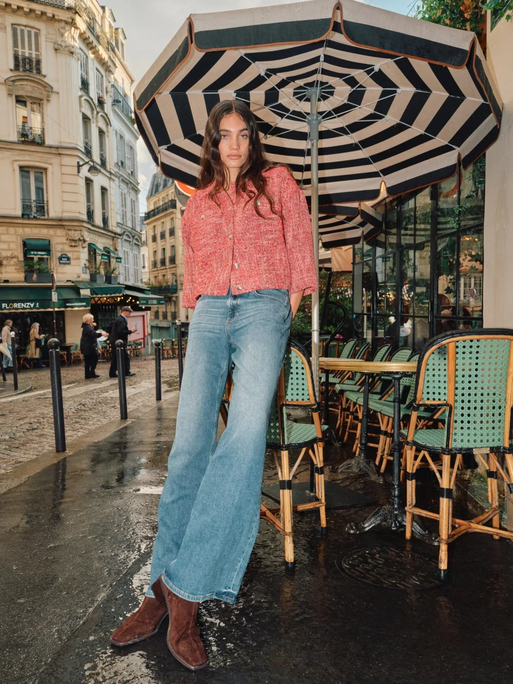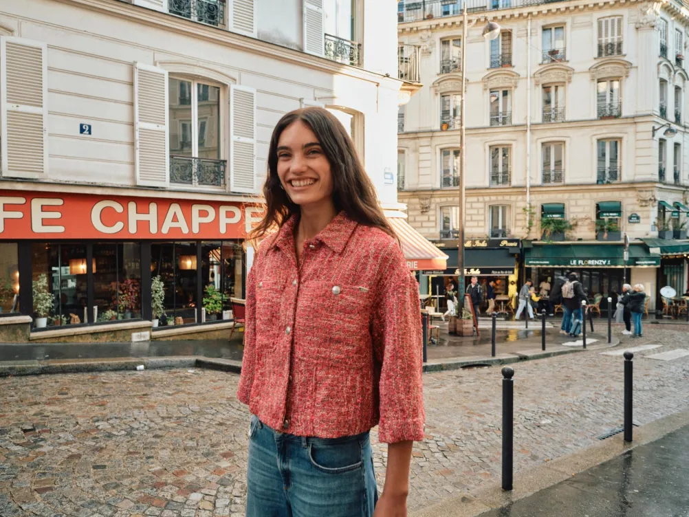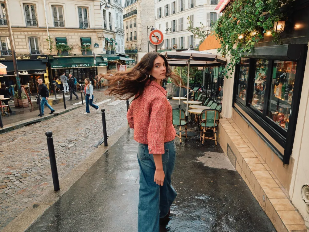 Elegant bouclé jakke i flot rød cayenne farve fra Mos Mosh. Med sølvknapper, brystlommer og klassisk krave, samt trekvartlange ærmer.