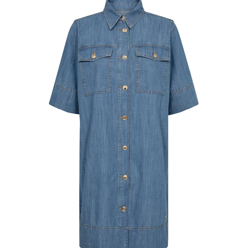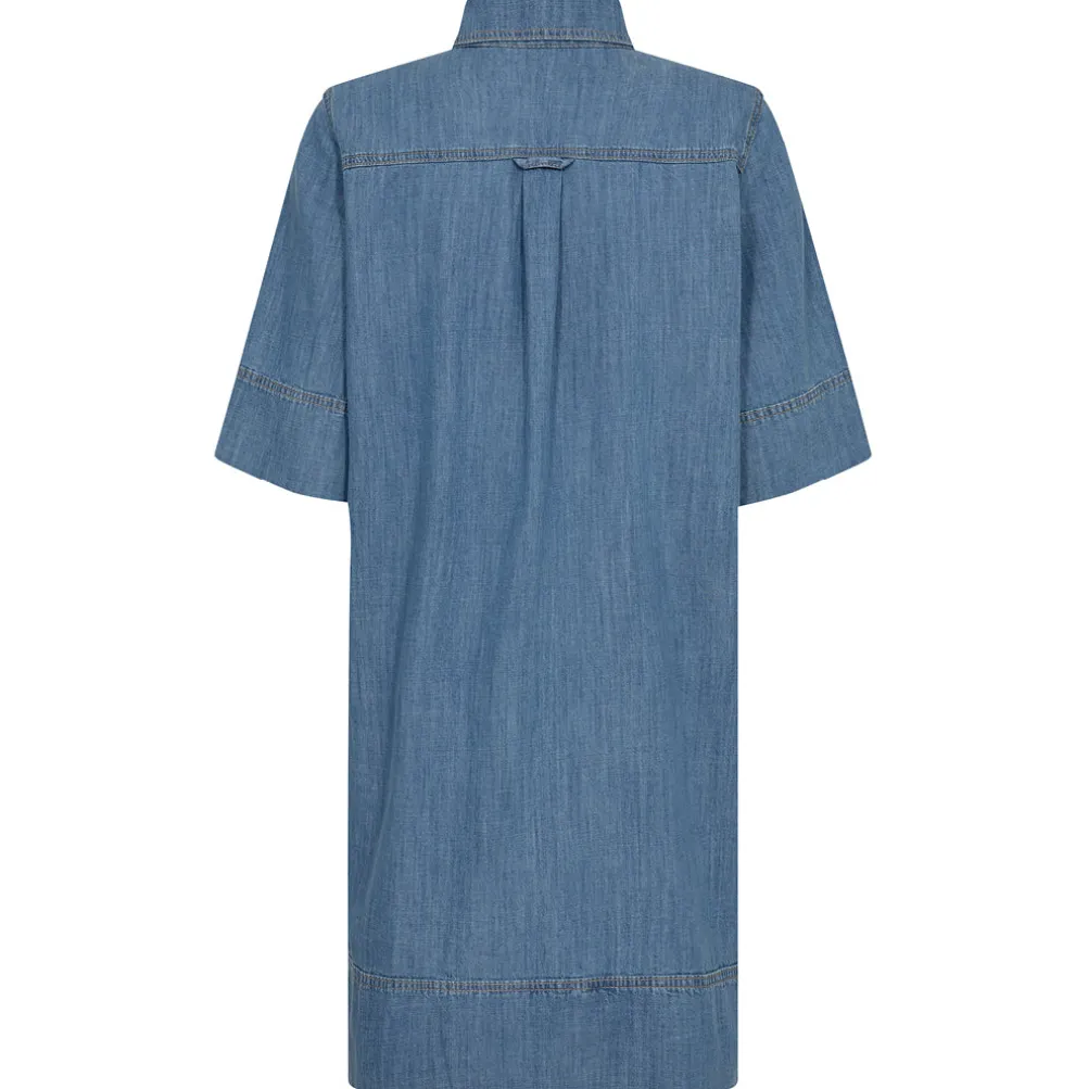 Skøn lyseblå denimkjole fra Mos Mosh med klassisk krave, store brystlommer og korte ærmer. Med smukke guldknapper.