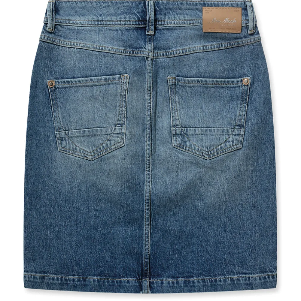 Lækker kort denimnederdel fra Mos Mosh med fine detaljer. Med dekorative broderier ved lommerne og lædermærke bagpå som finish.