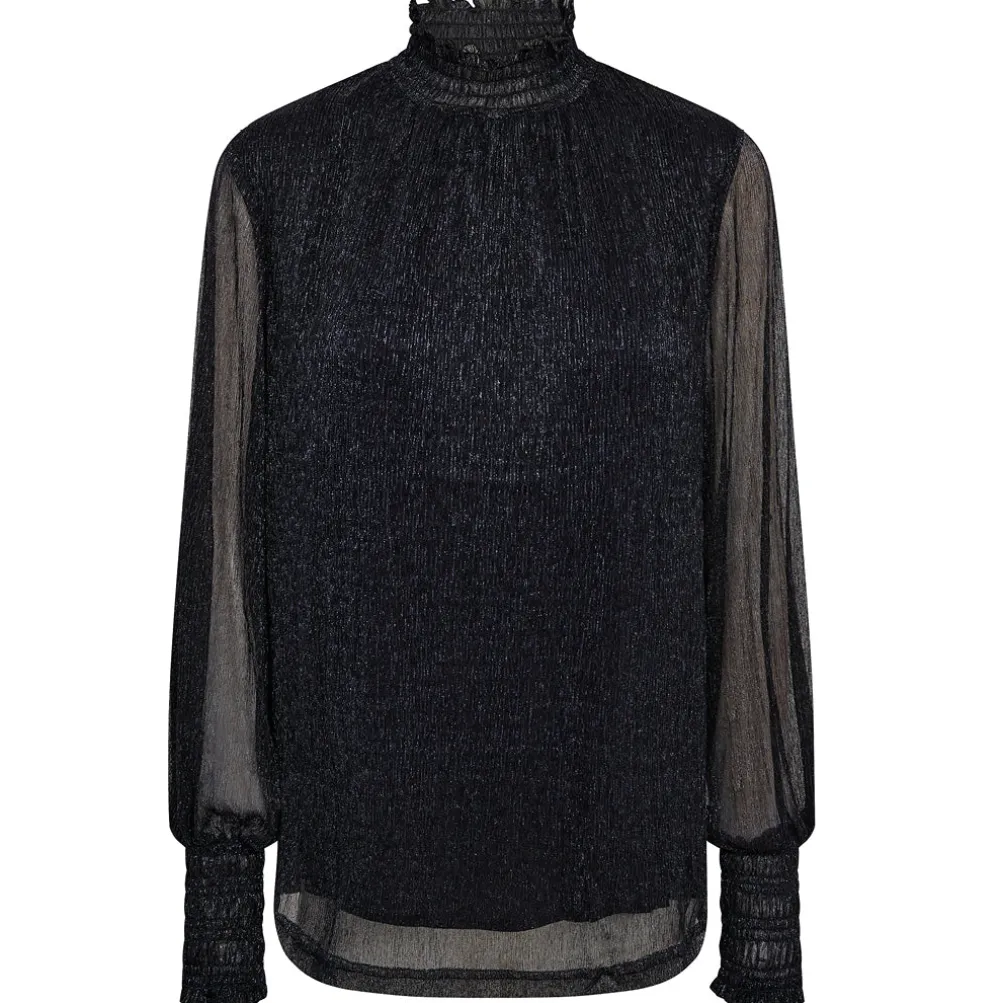 Smuk mørkeblå bluse med glimmer fra Mos Mosh. Med lange gennemsigtige ærmer og høj hals med små flæser. Perfekt til både hverdag og fest.