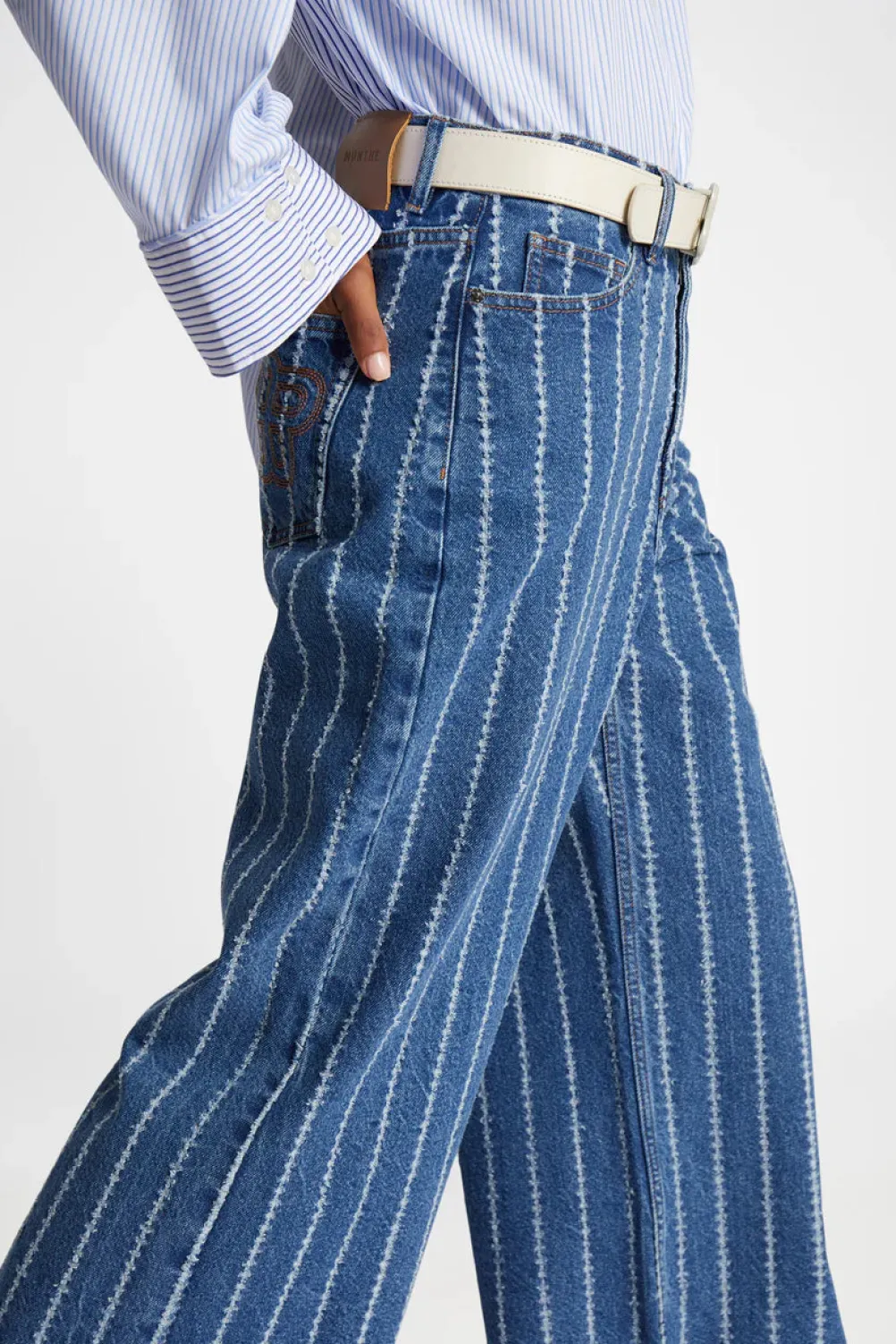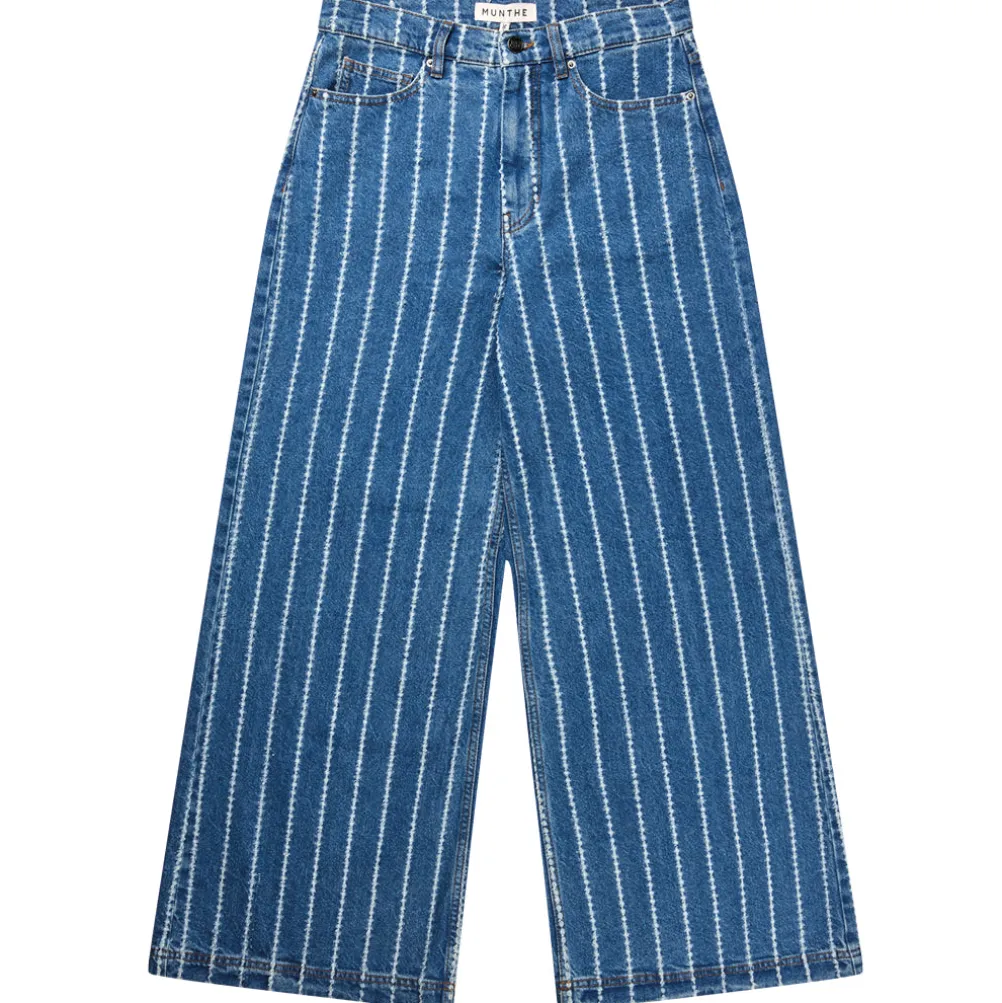 Flotte nålestribede jeans fra Munthe designet med høj talje og brede ben. Med for- og baglommer, hvor en af 銀誼aglommerne har et smukt MUNTHE emblem broderi på.