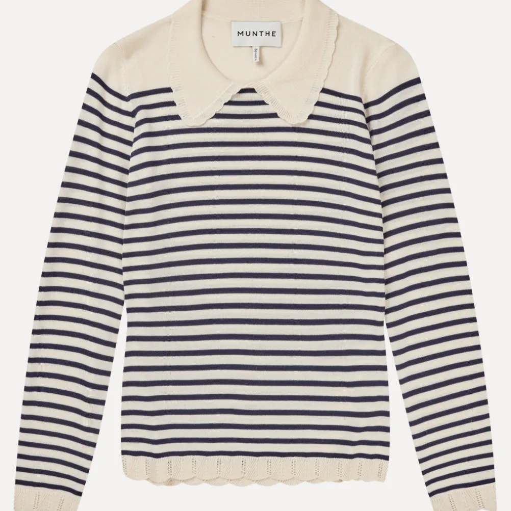 Elegant stribet strik fra Munthe med krave og med fine strikkede blondedetaljer. Lavet i en blød uldblanding.