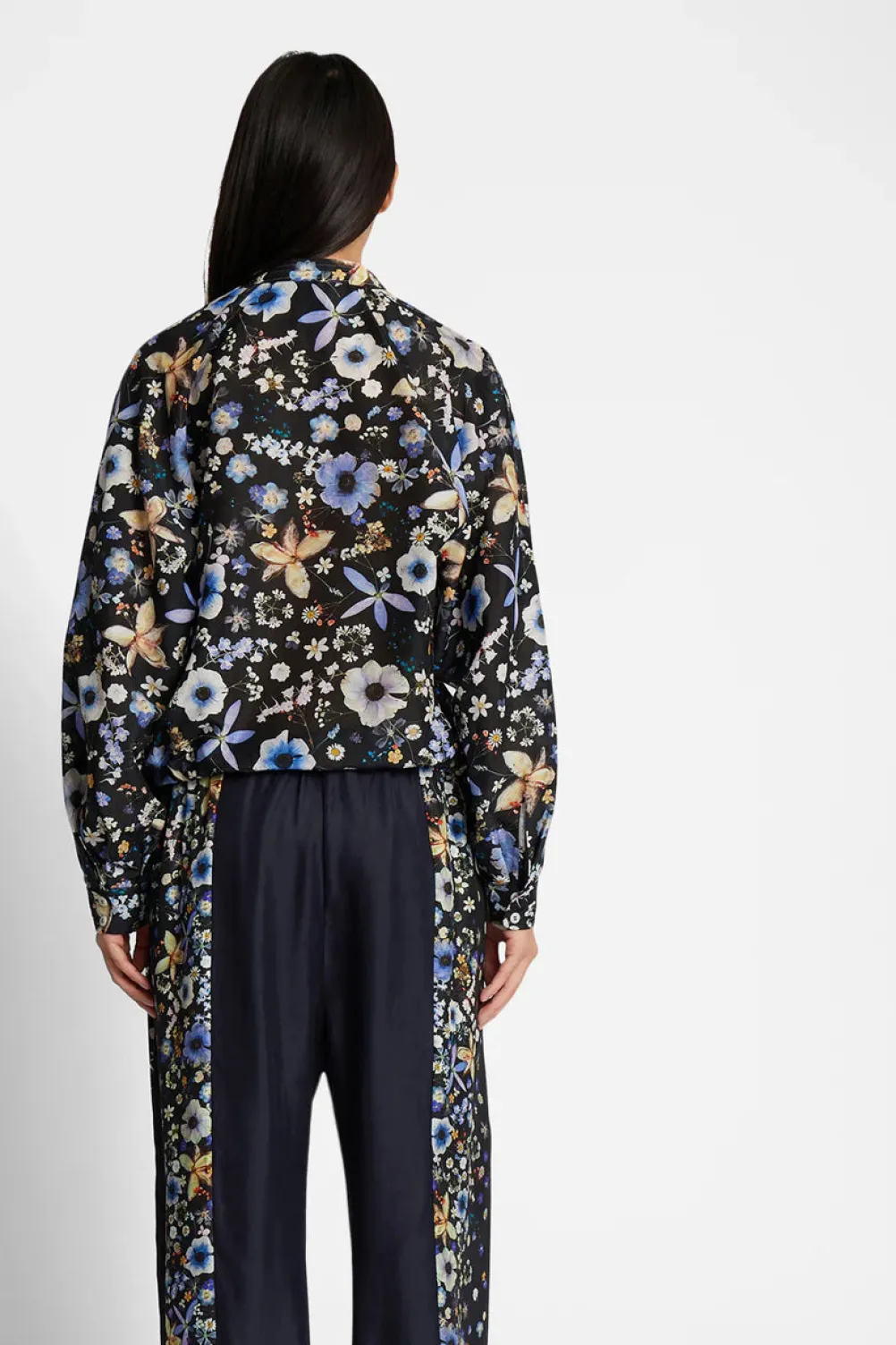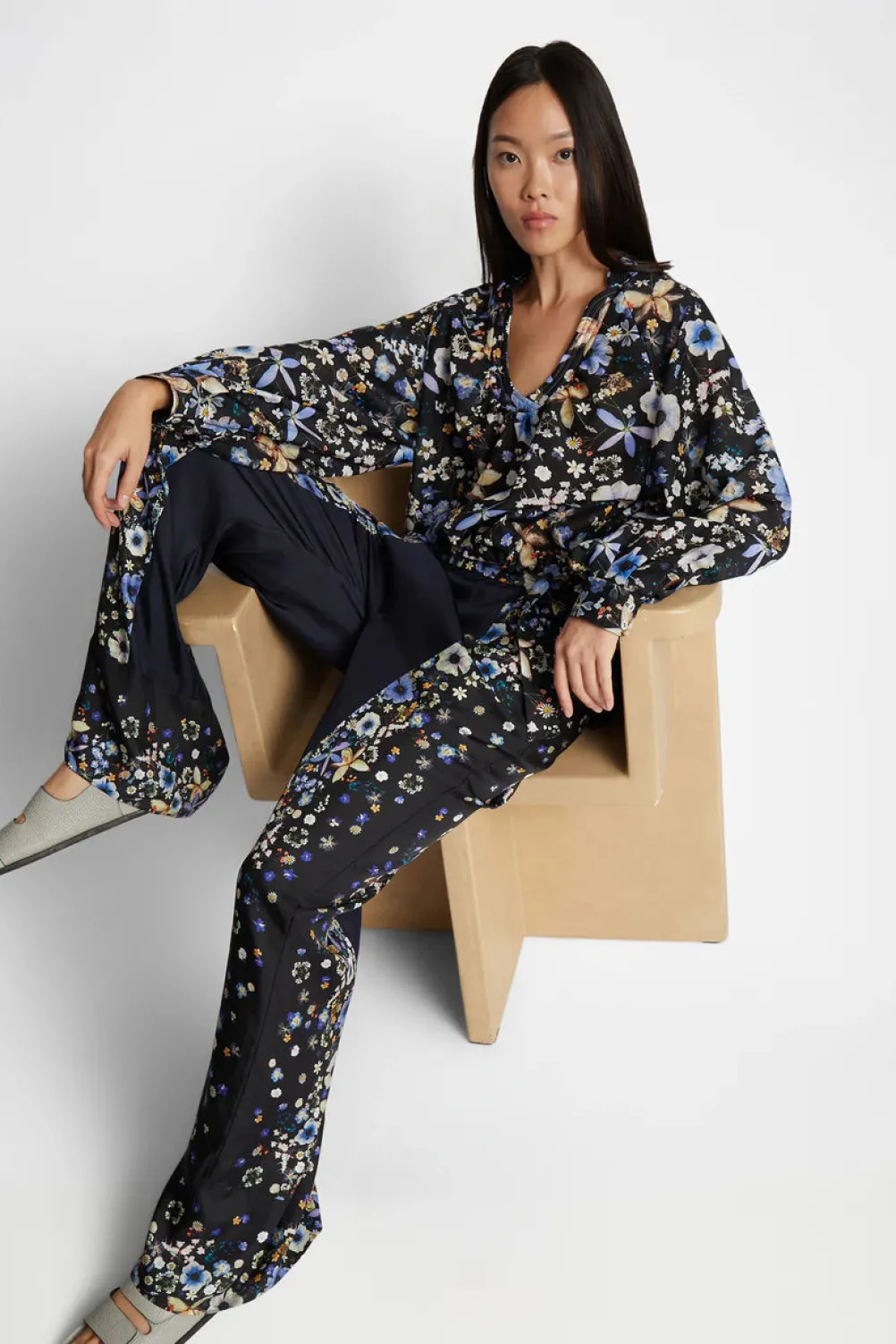 Smukke lange løse bukser i 100 % silke med flot unikt blomsterprint fra Munthe. Bukserne har bindebånd i taljen og lommer.