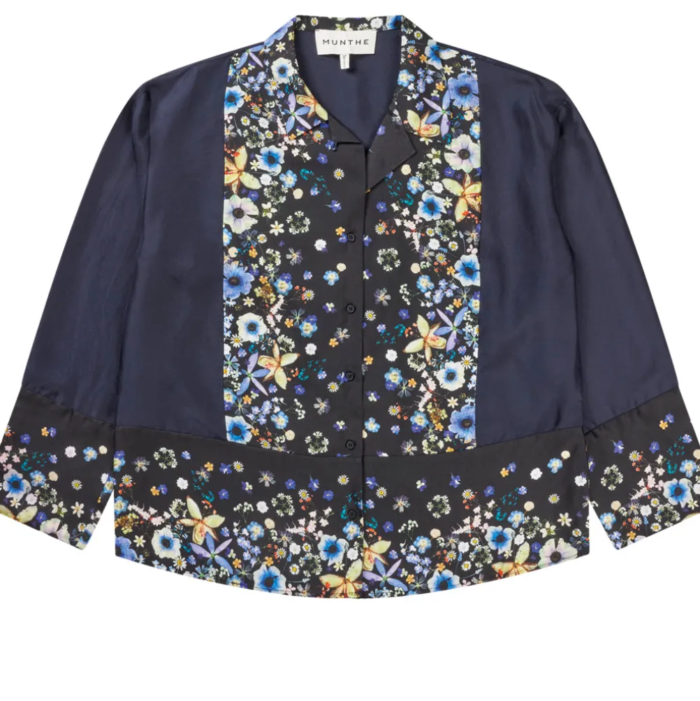 Super smuk skjorte fra Munthe i 100 % silke med det fineste blomsterprint. Med lange ærmer, klassisk krave og knaplukning.