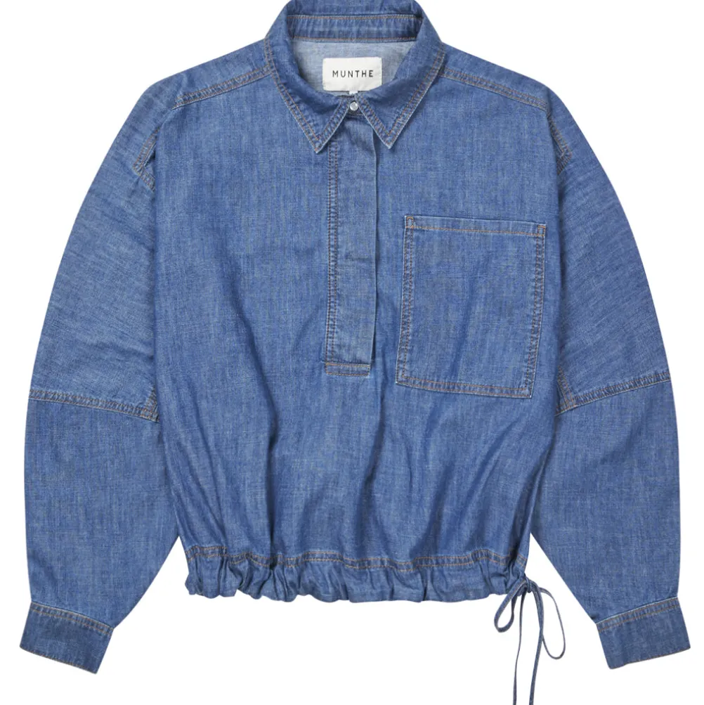Cool denimskjorte fra Munthe med halvvejs åbning ved brystet og en elegant bindedetalje i taljen. Med en brystlomme, løs pasform og lavet i 100% økologisk bomuld.