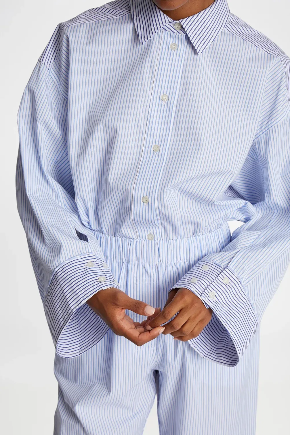 Klassisk oversize skjorte fra Munthe med nålestriber, klassisk krave og brede ærmer med manchetter.
