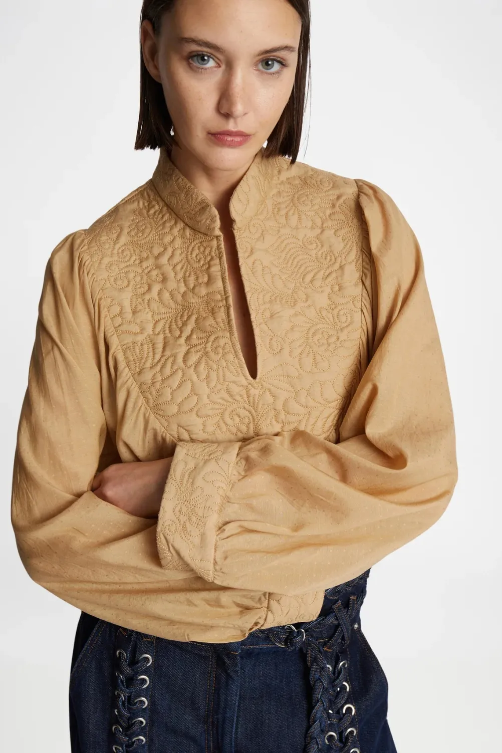 Flot bluse fra Munthe med et elegant quiltet blomsterbroderi ved bryst og ærme. Designet med kinakrave og brede løse ærmer med brede manchetter.