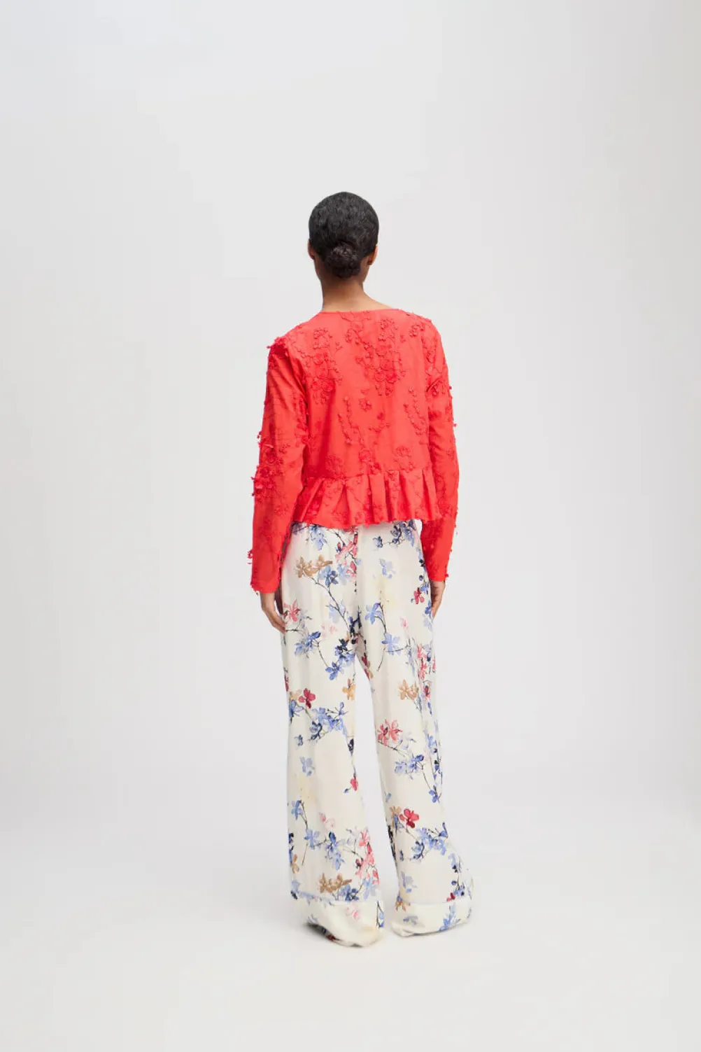 Smuk rød bluse fra Munthe med de fineste detaljer! Med all-over blomster applikationer og en elegant peplum bund. Blusen kan åbnes halvvejs ned, og er designet med en skjulte knapper.