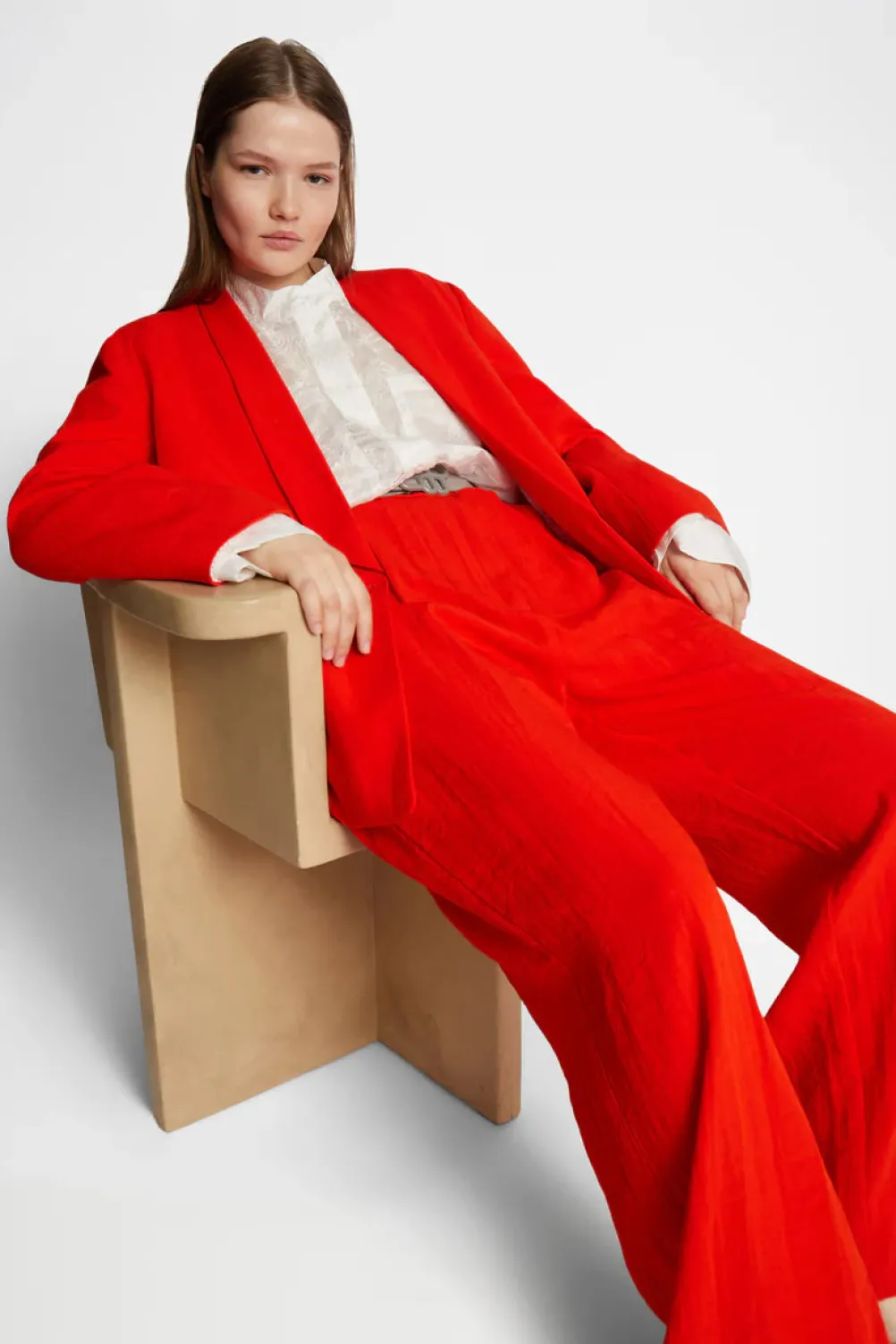 Smukke lange løse bukser fra Munthe med pressefolder og lommer i siderne. Lavet i en flot orangerød farve.