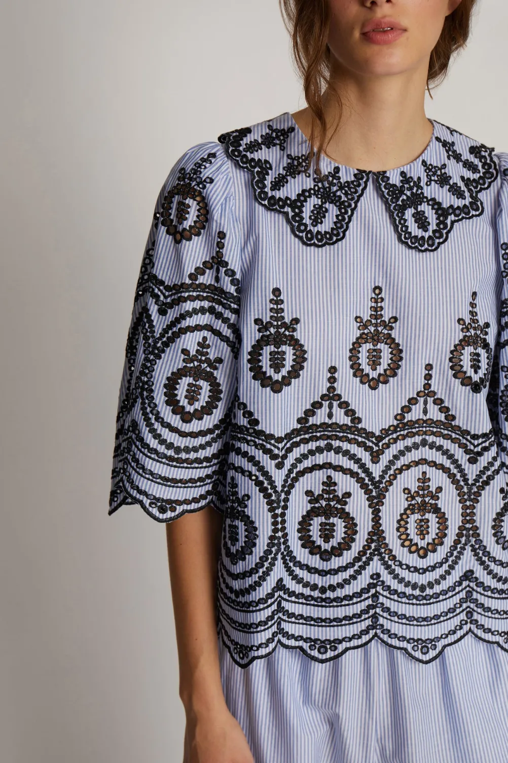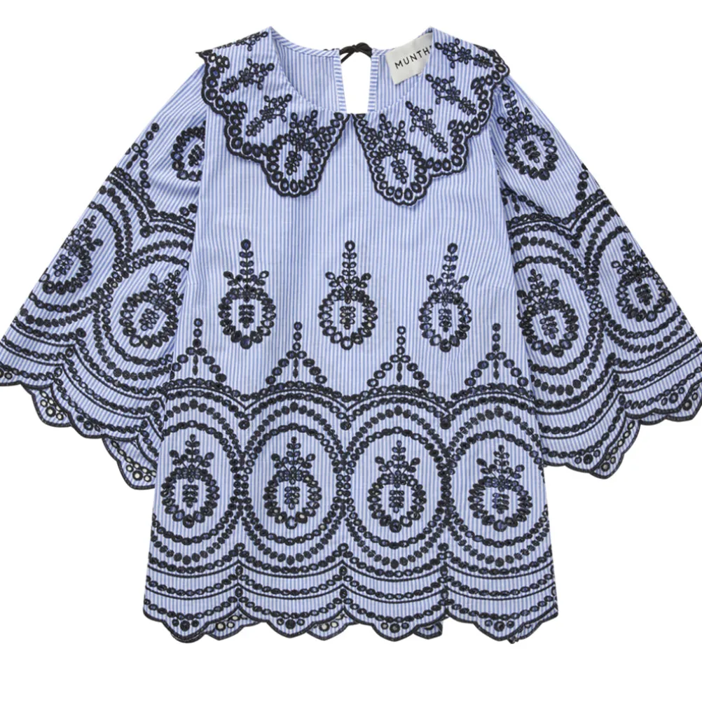 Smuk og elegant top fra Munthe med fine blondedetaljer! Skjorten har v-udskæring med mulighed for at åbne eller lukke halsen med en fin knaplukning. Normal pasform.
