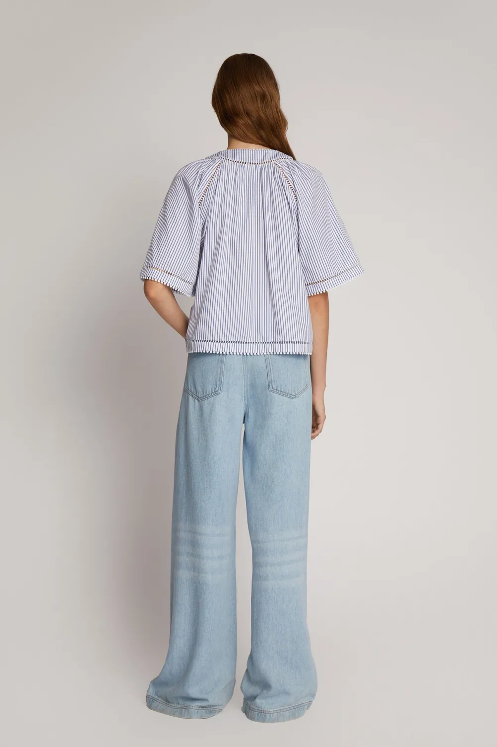 Smuk og elegant top fra Munthe med fine blondedetaljer! Skjorten har v-udskæring med mulighed for at åbne eller lukke halsen med en fin knaplukning. Normal pasform.