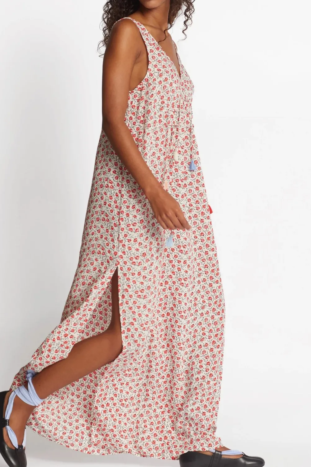 Flot boho-inspireret kjole fra Munthe med flot rødt blomsterprint og bindebånd med kvaster i forskellige farver.