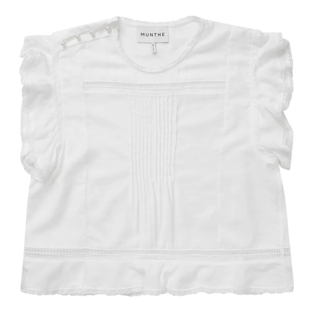 Smuk ærmeløs top fra Munthe med fine blondebånd og flæser. Knappes med fine perleknapper ved den ene skulder.