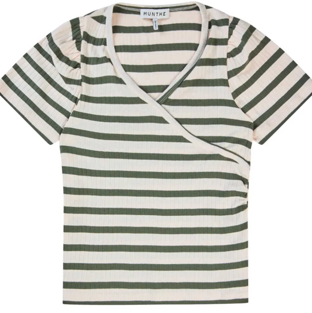 Fin stribet t-shirt fra Munthe med slå-om effekt. Normal pasform og korte ærmer med et let puf ved skulderen.