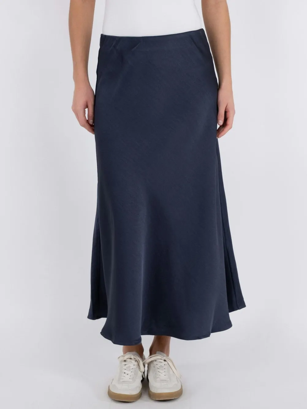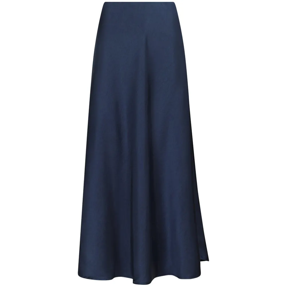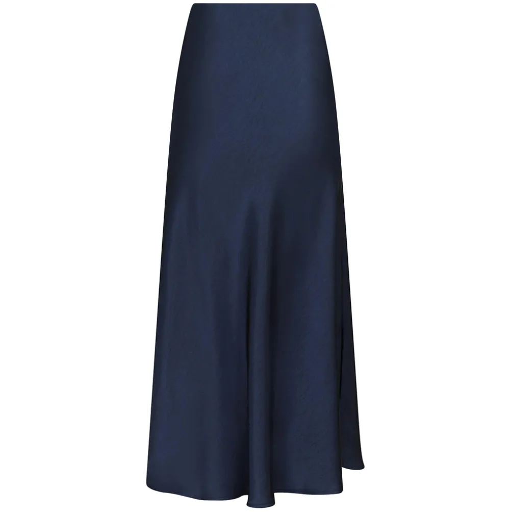 Flot lang mørkeblå satinnederdel fra Neo Noir. Nederdelen er skåret på skrå og følger kroppen og falder smukt. Med elastik i taljen. Perfekt til både hverdag og fest.