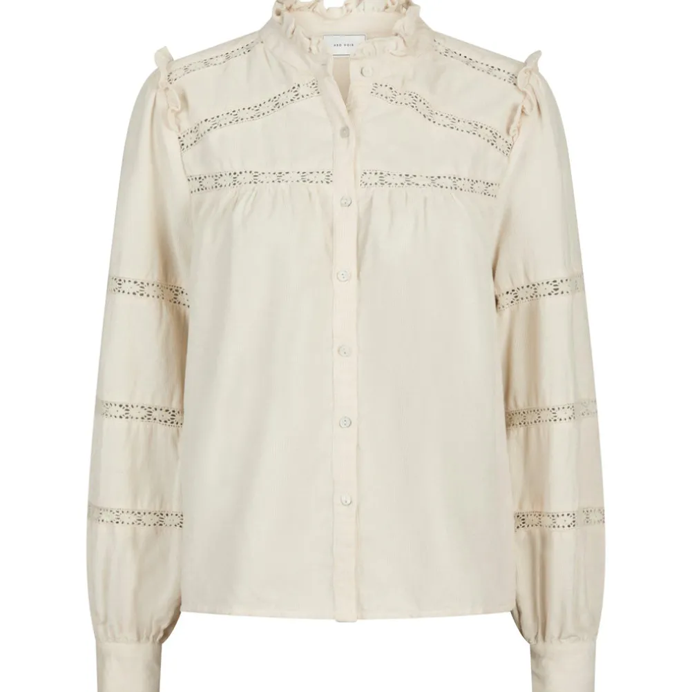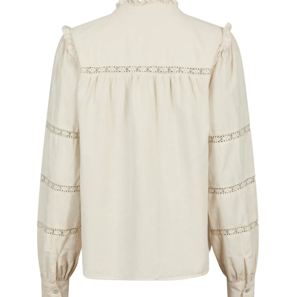 Elegant bluse fra Neo Noir med let gennemsigtige blondebånd og små flæser ved kraven. Med knaplukning.