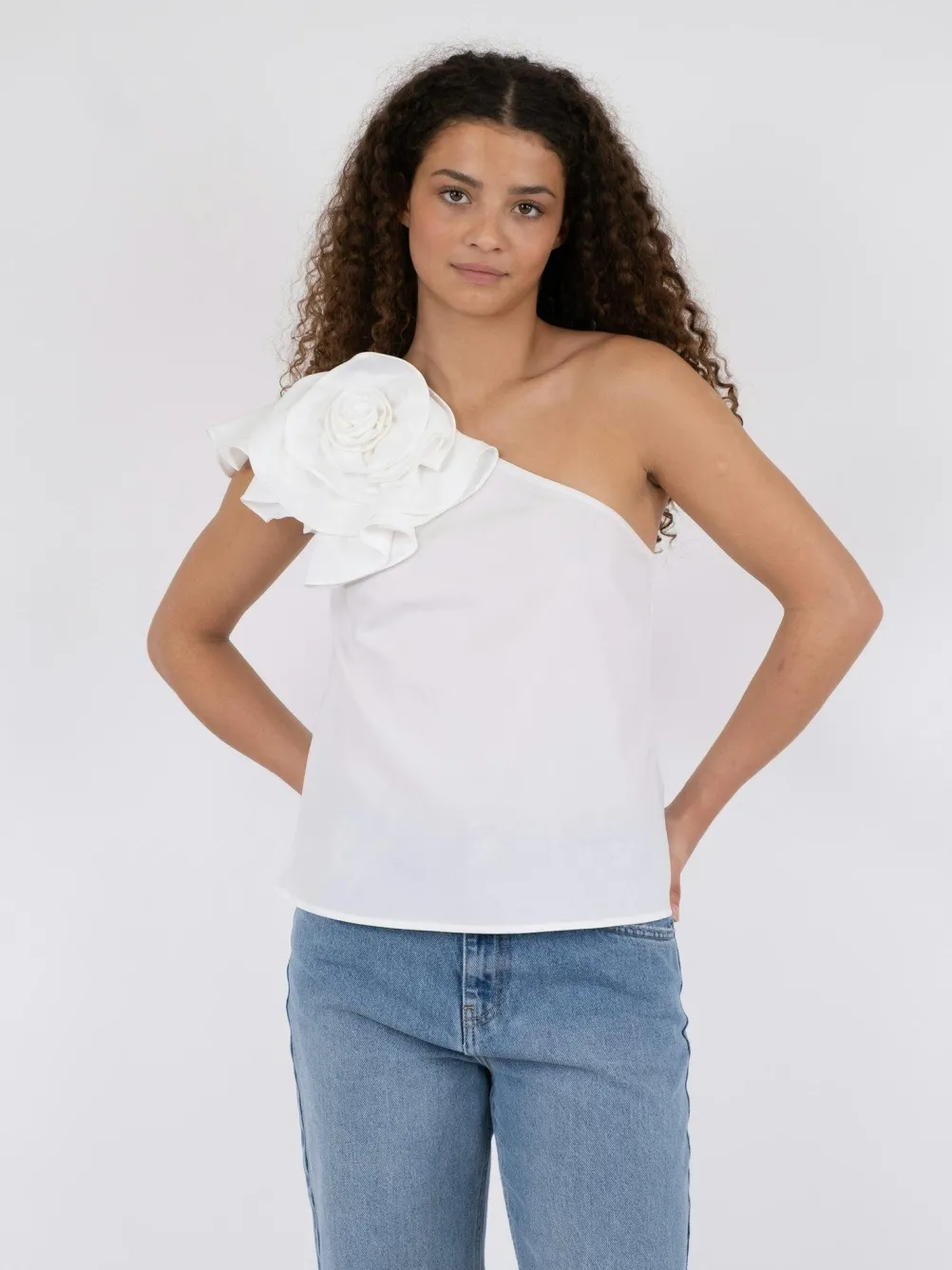 Super fin one shoulder top fra Neo Noir med flot rosedetalje på skulderen. Perfekt til både hverdag og fest.