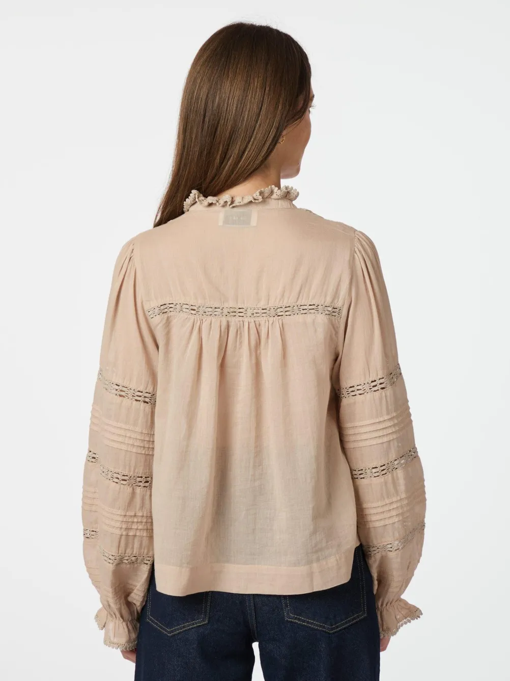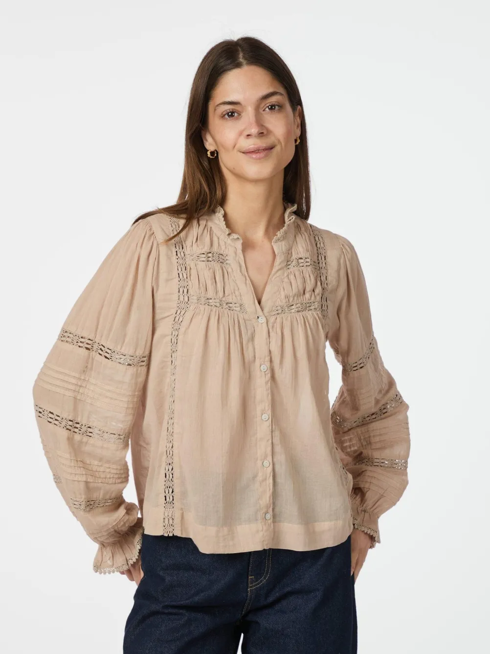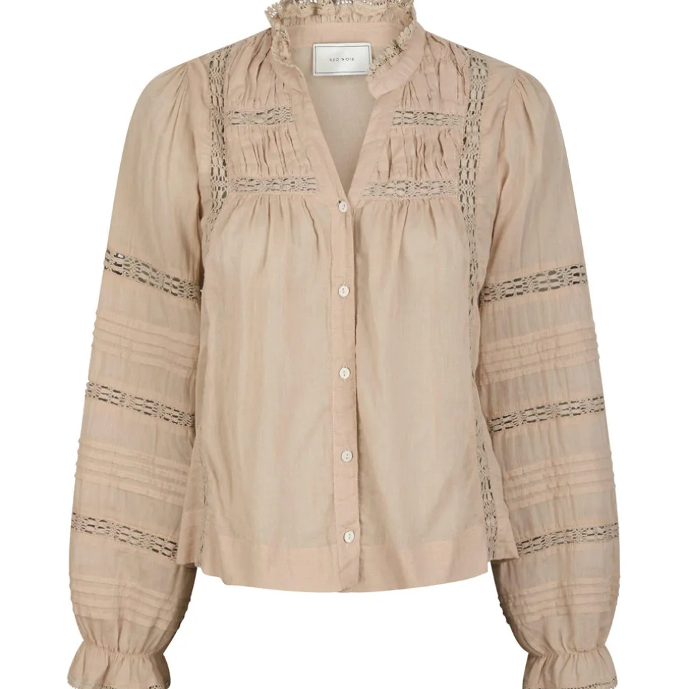 Elegant bluse fra Neo Noir med søde blondebånd, v-udskæring og lille flæse ved kraven og ærmerne. Med smock påbrystet.