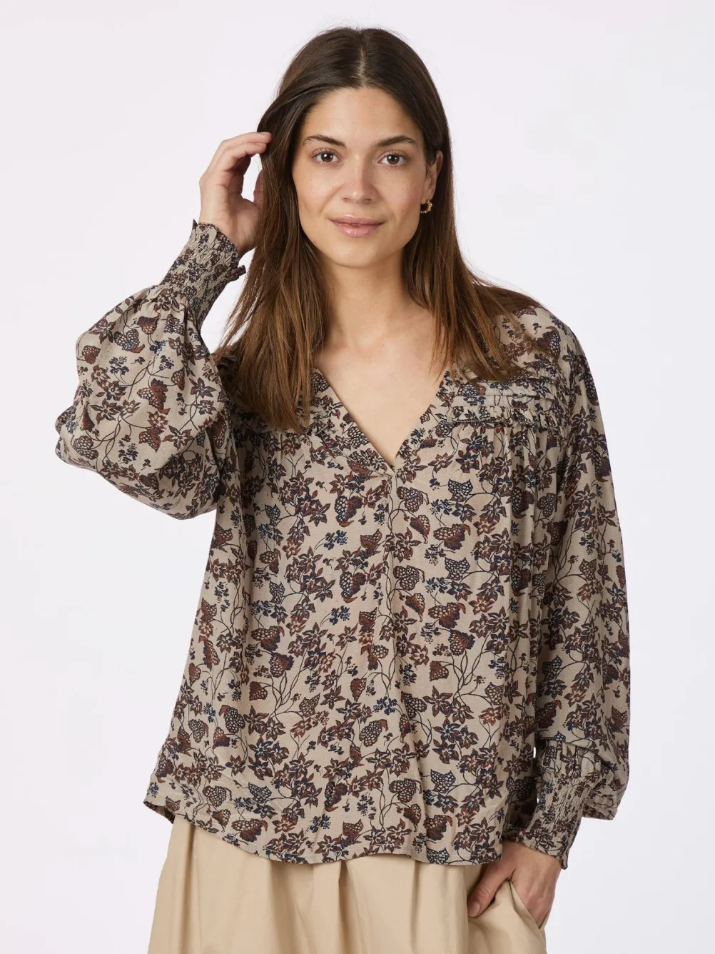 Smuk bluse med blomstermønster fra Neo Noir med lange løse ærmer med manchetter og v-udskæring. Perfekt til både hverdag og fest.