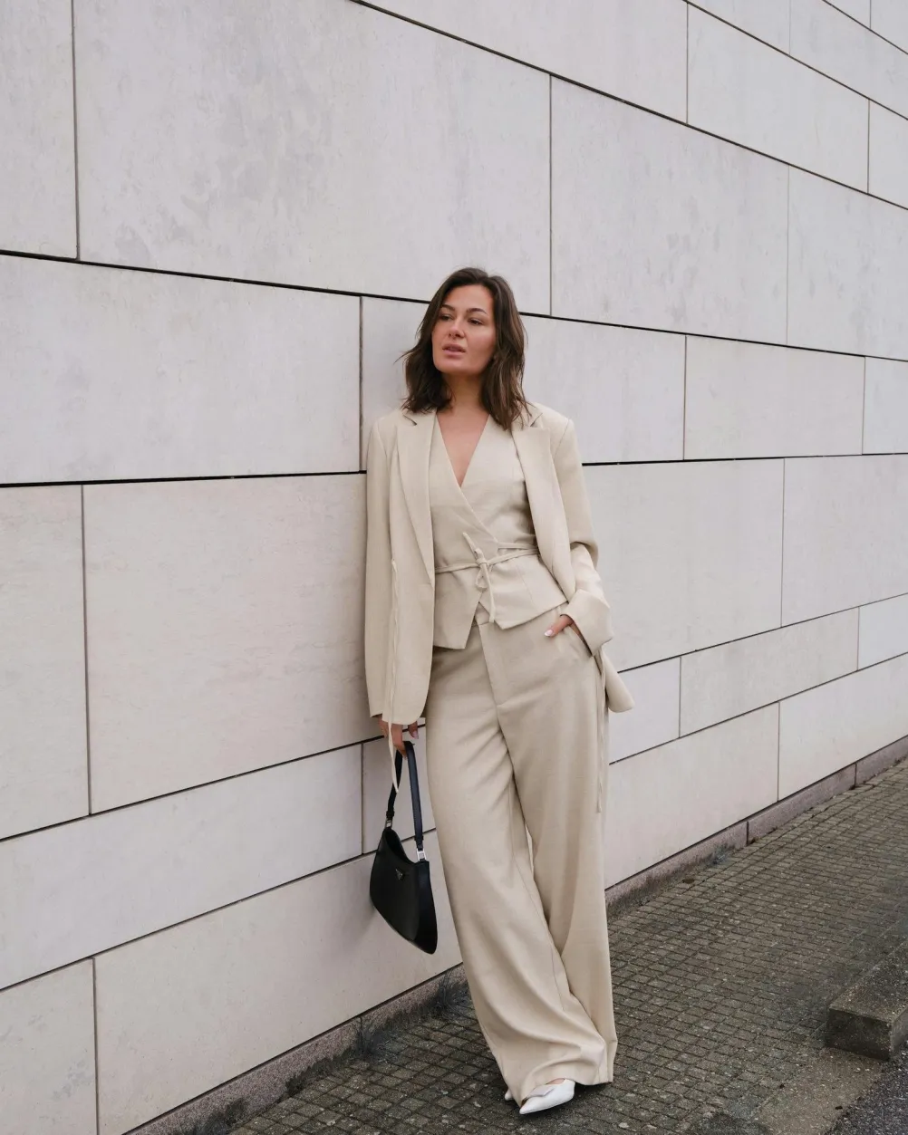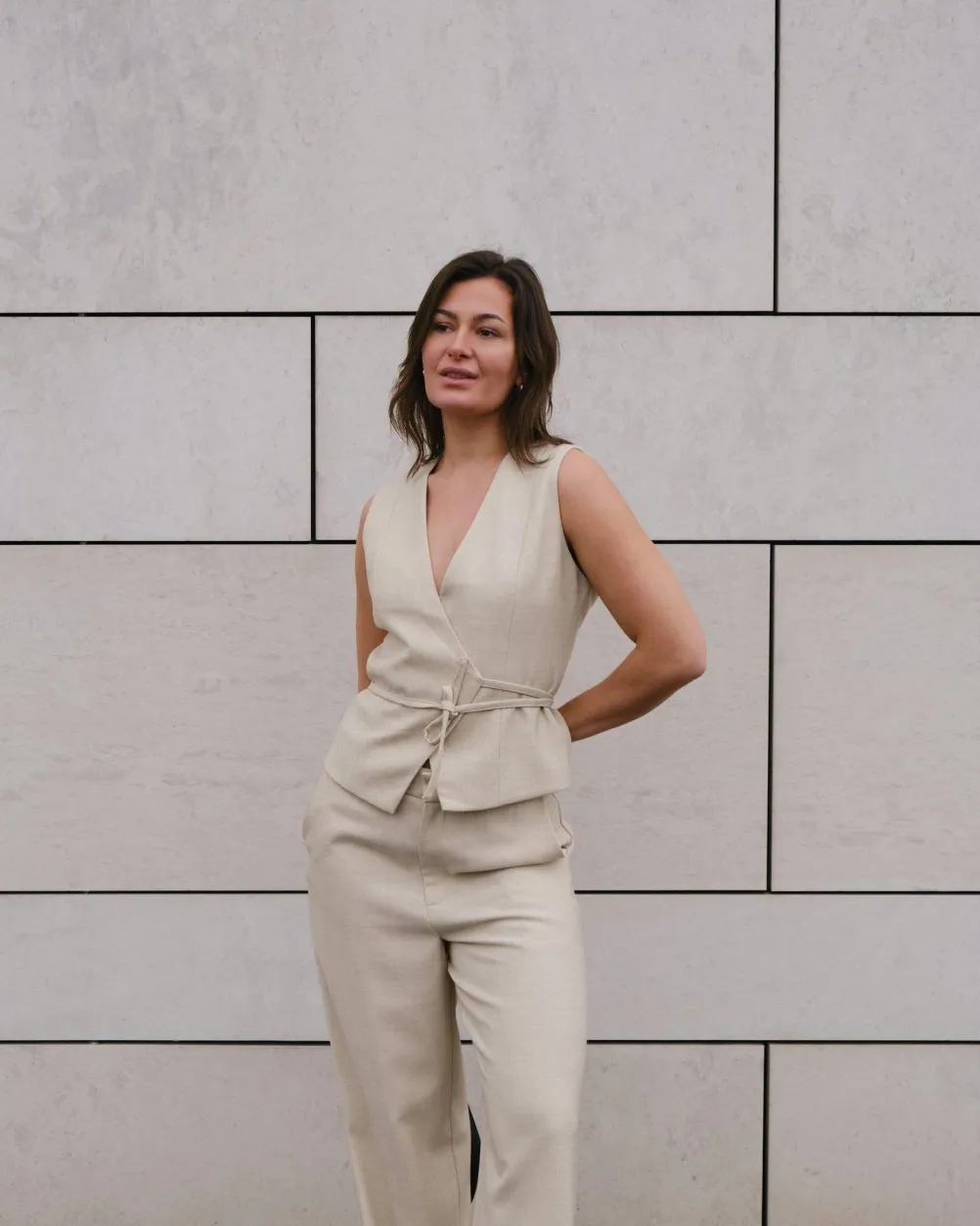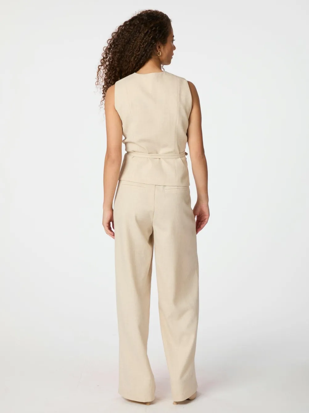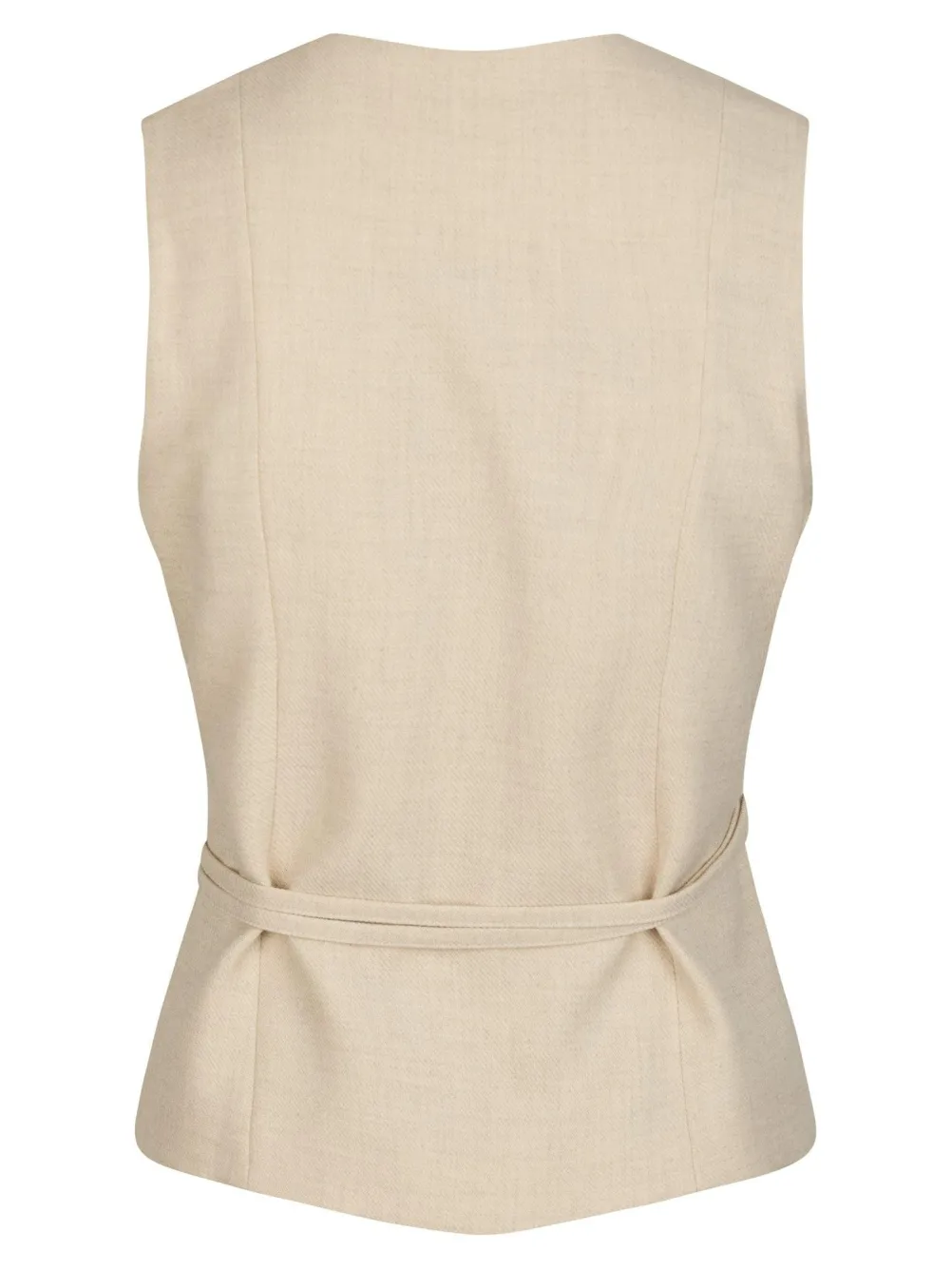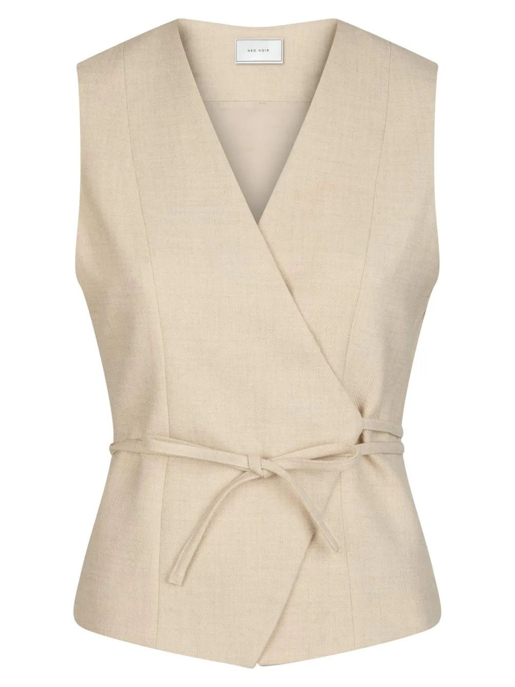 Elegant beige melange vest fra Neo Noir, der lukkes med bindebånd i siden. Tæt pasform.