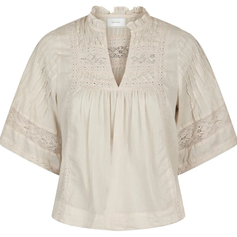 Smuk bluse fra Neo Noir med fine blonder, v-ukskæring og små flæser ved kraven. Med korte brede ærmer med blondebånd.