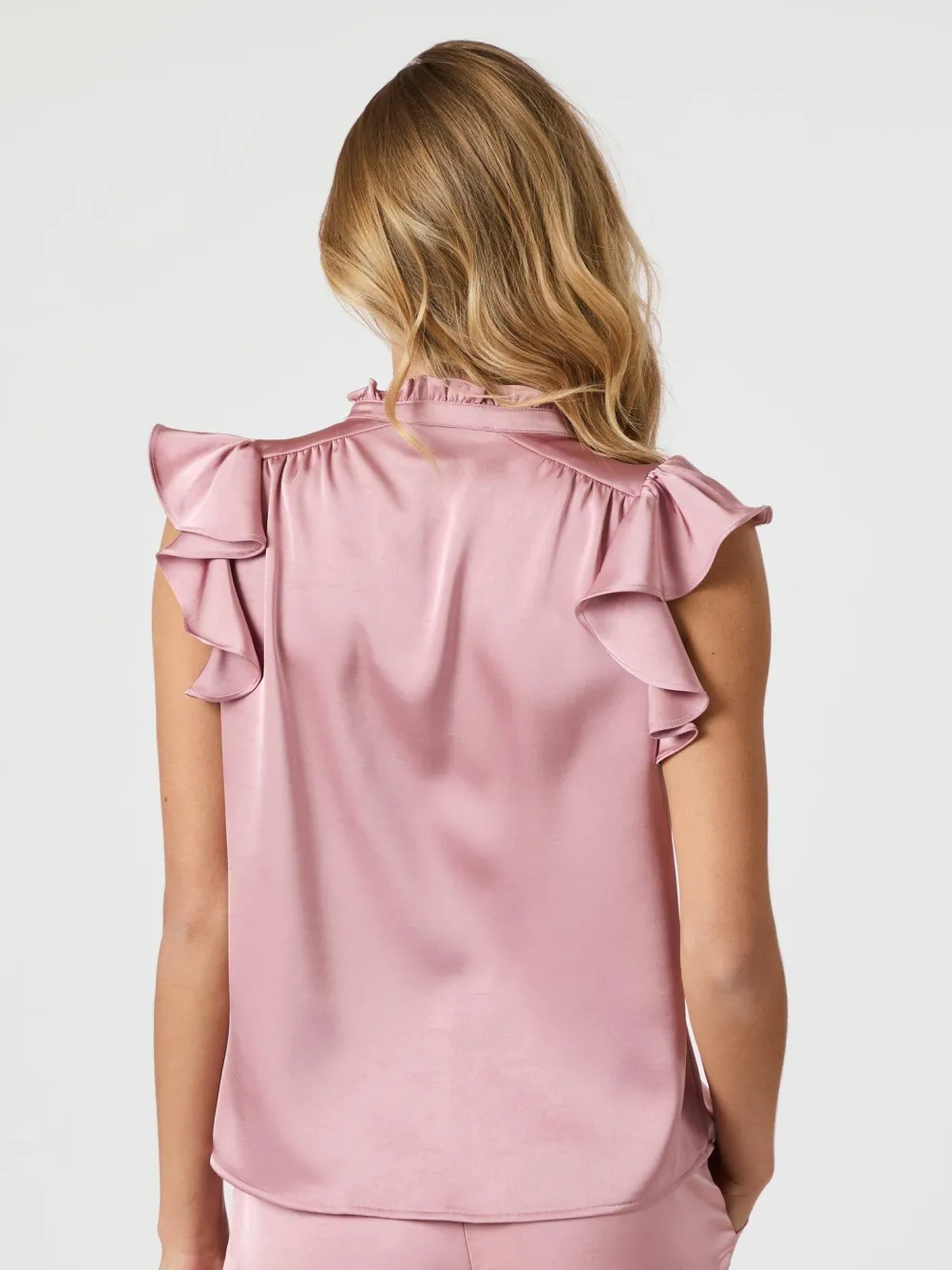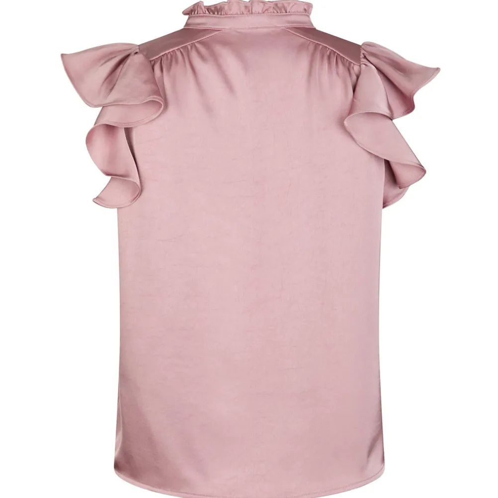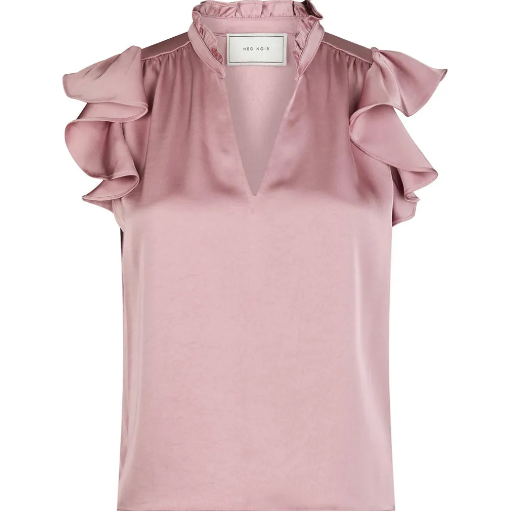 Smuk satintop fra Neo Noir med v-udskæring og flæser ved skuldrene og ved kraven. Perfekt til både hverdag og fest. Kan med fordel styles med den matchende nederdel.