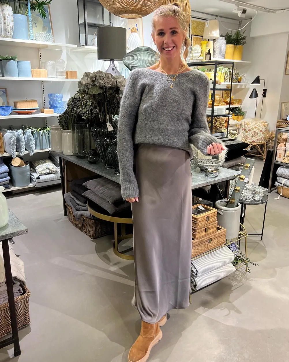 Flot lang satinnederdel fra Neo Noir. Nederdelen er skåret på skrå og følger kroppen og falder smukt. Med elastik i taljen. Perfekt til både hverdag og fest.