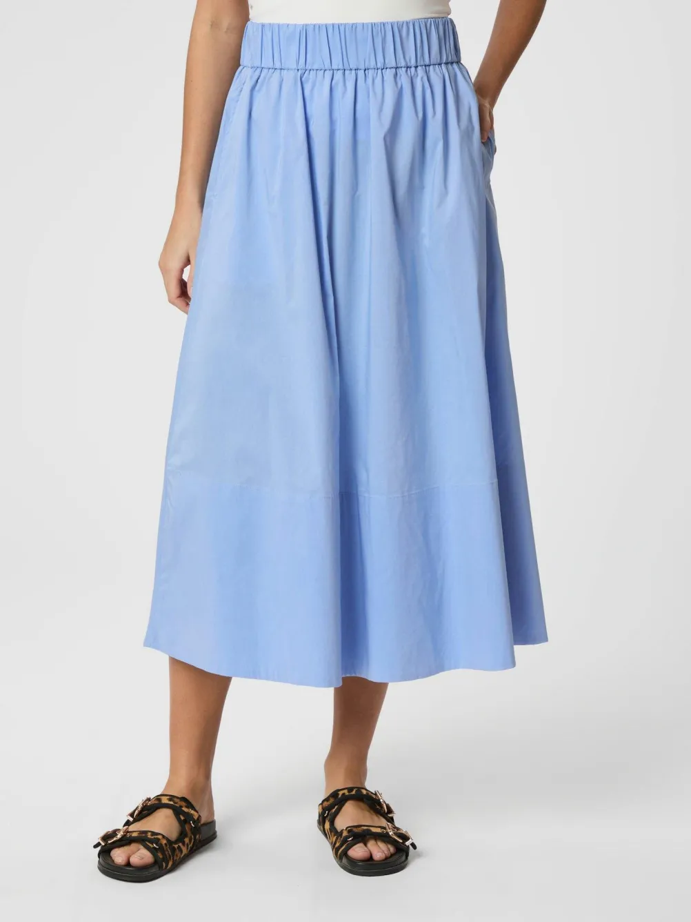 Flot lang populær nederdel fra Neo Noir lavet i en fin bomuldspoplin. Nederdelen har en høj blød elastik i taljen, lommer og vidde i bunden.