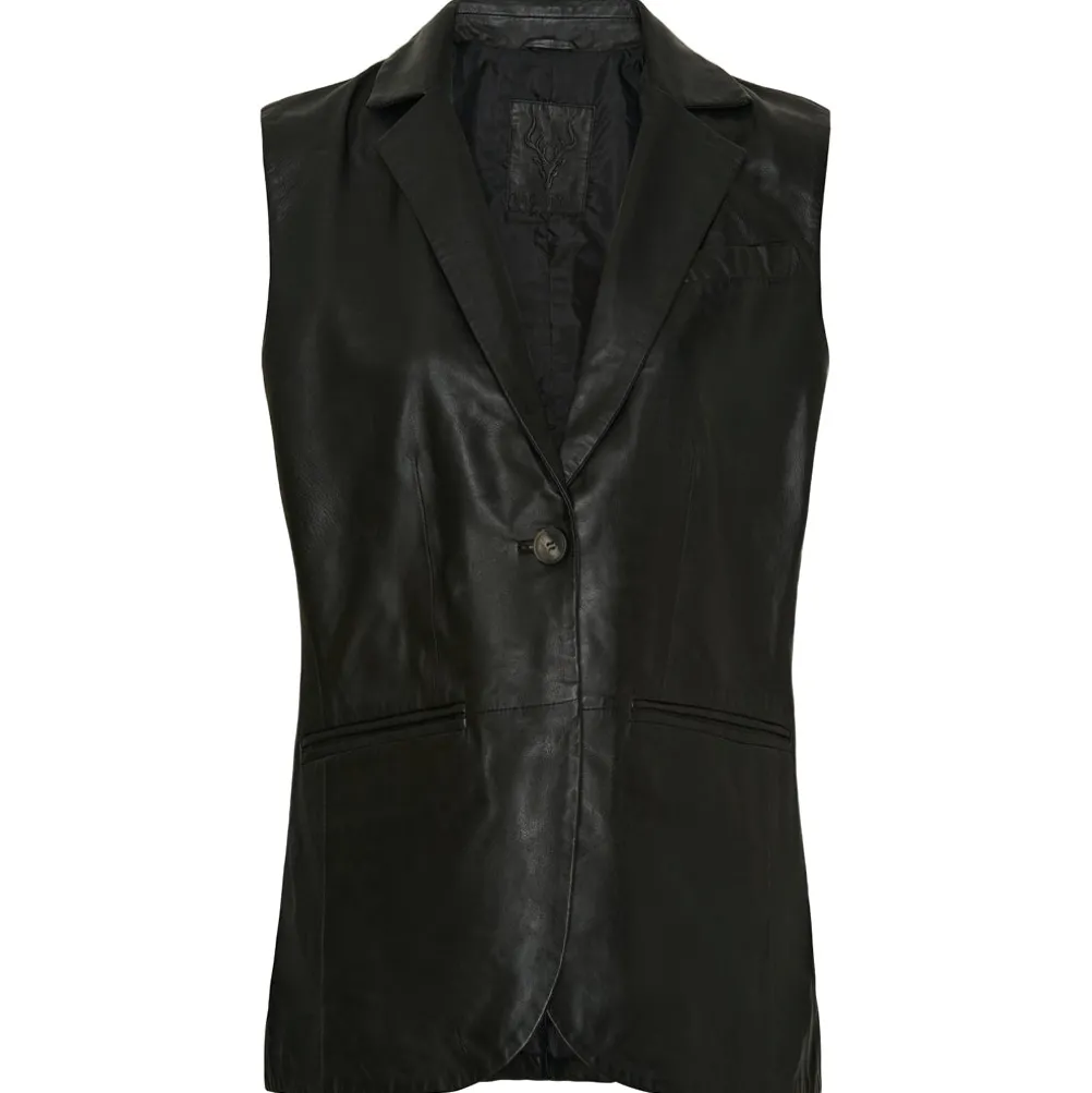 Super lækker sort skindvest fra Notyz. Lavet i en dejlig blød kvalitet. Lukkes med en enkelt knap foran. Style over bluser og kjoler.
